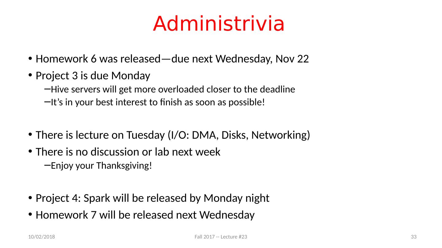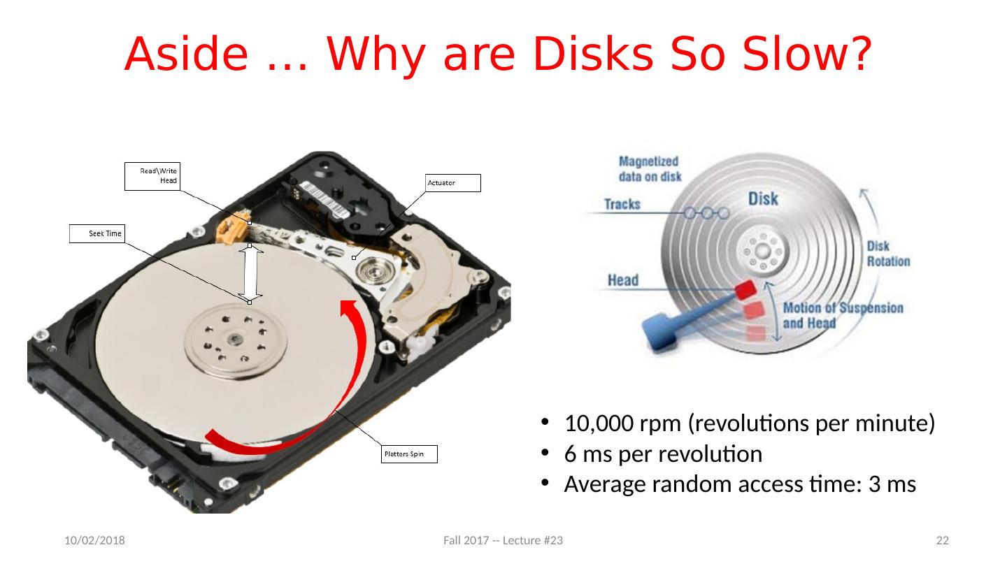 22 .Aside … Why are Disks So Slow? 10,000 rpm (revolutions per minute) 6 ms per revolution Average random access time: 3 ms 22 Fall 2017 -- Lecture #23 11/15/17