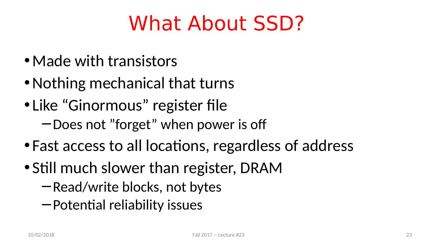 23 .What About SSD? Made with transistors Nothing mechanical that turns Like “Ginormous” register file D oes not ”forget” when power is off Fast access to all locations, regardless of address Still much slower than register, DRAM Read/write blocks, not bytes Potential reliability issues 23 Fall 2017 -- Lecture #23 11/15/17