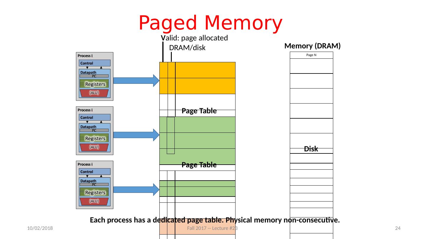 24 .Paged Memory Page N Memory (DRAM) Page Table Page Table Each process has a dedicated page table. Physical memory non-consecutive. V alid: page allocated DRAM/disk Disk 24 Fall 2017 -- Lecture #23 11/15/17