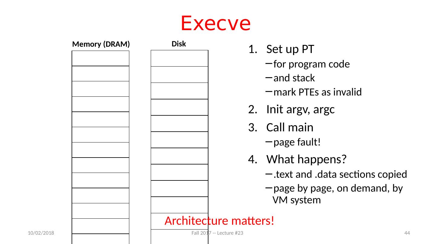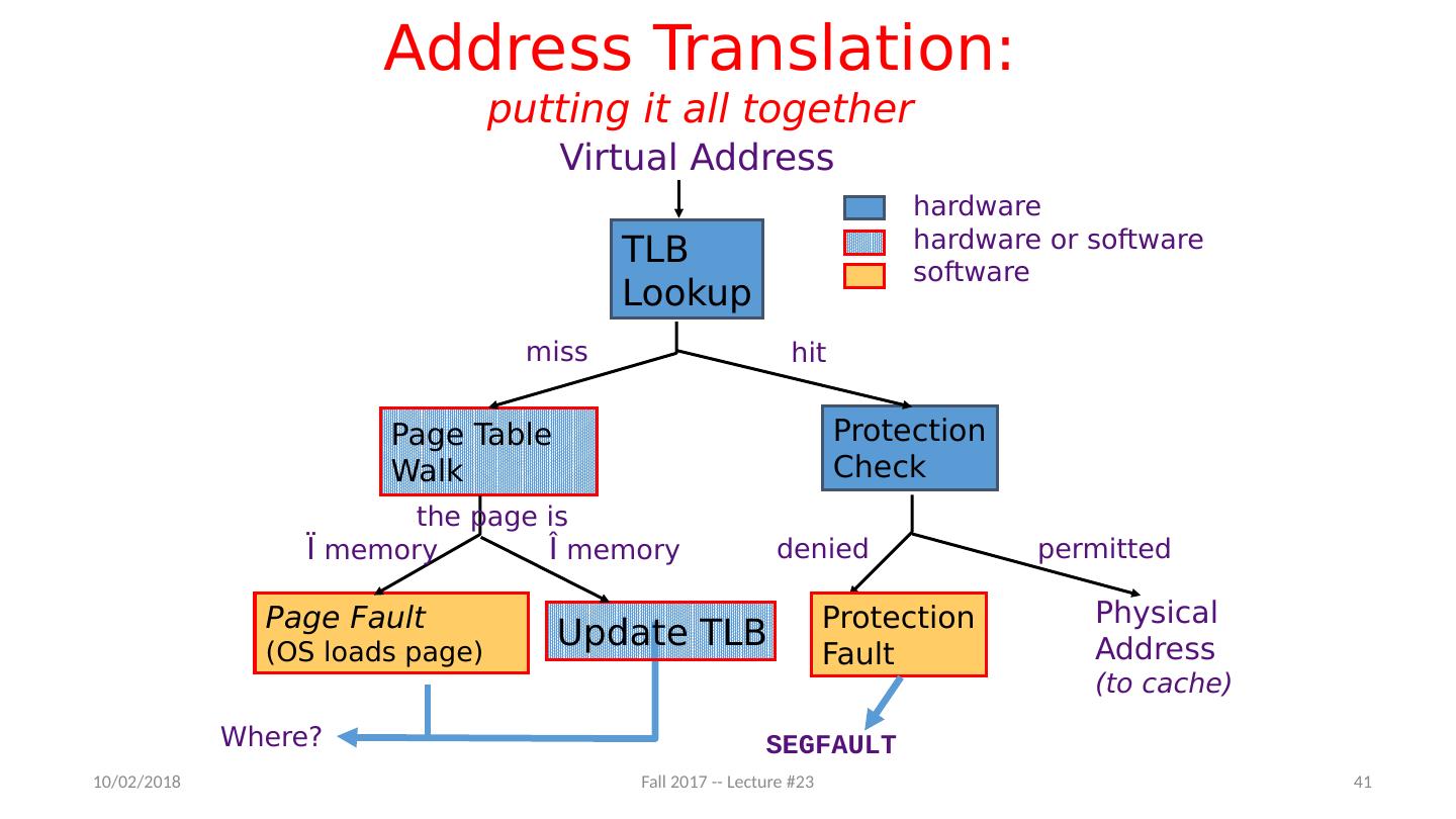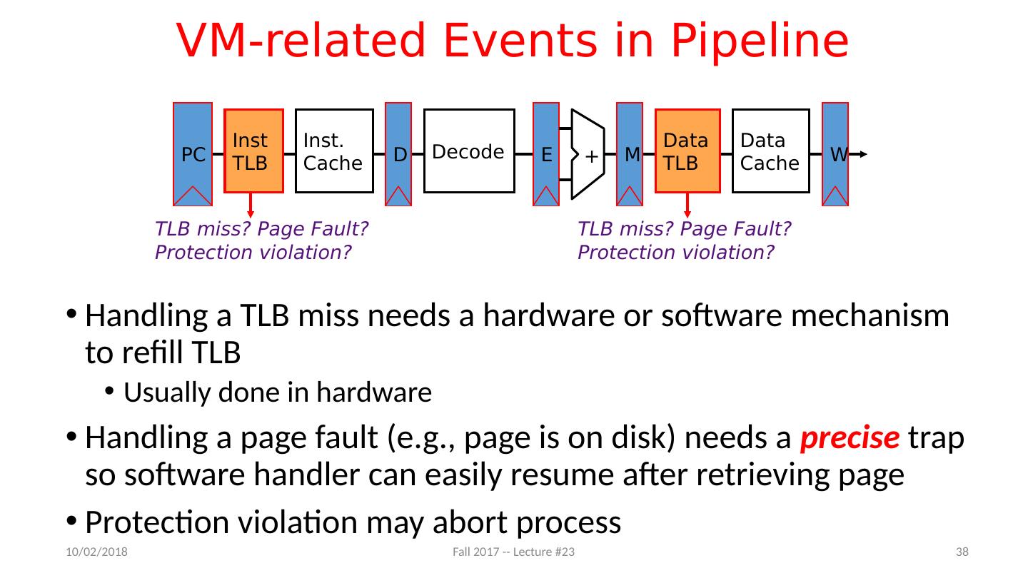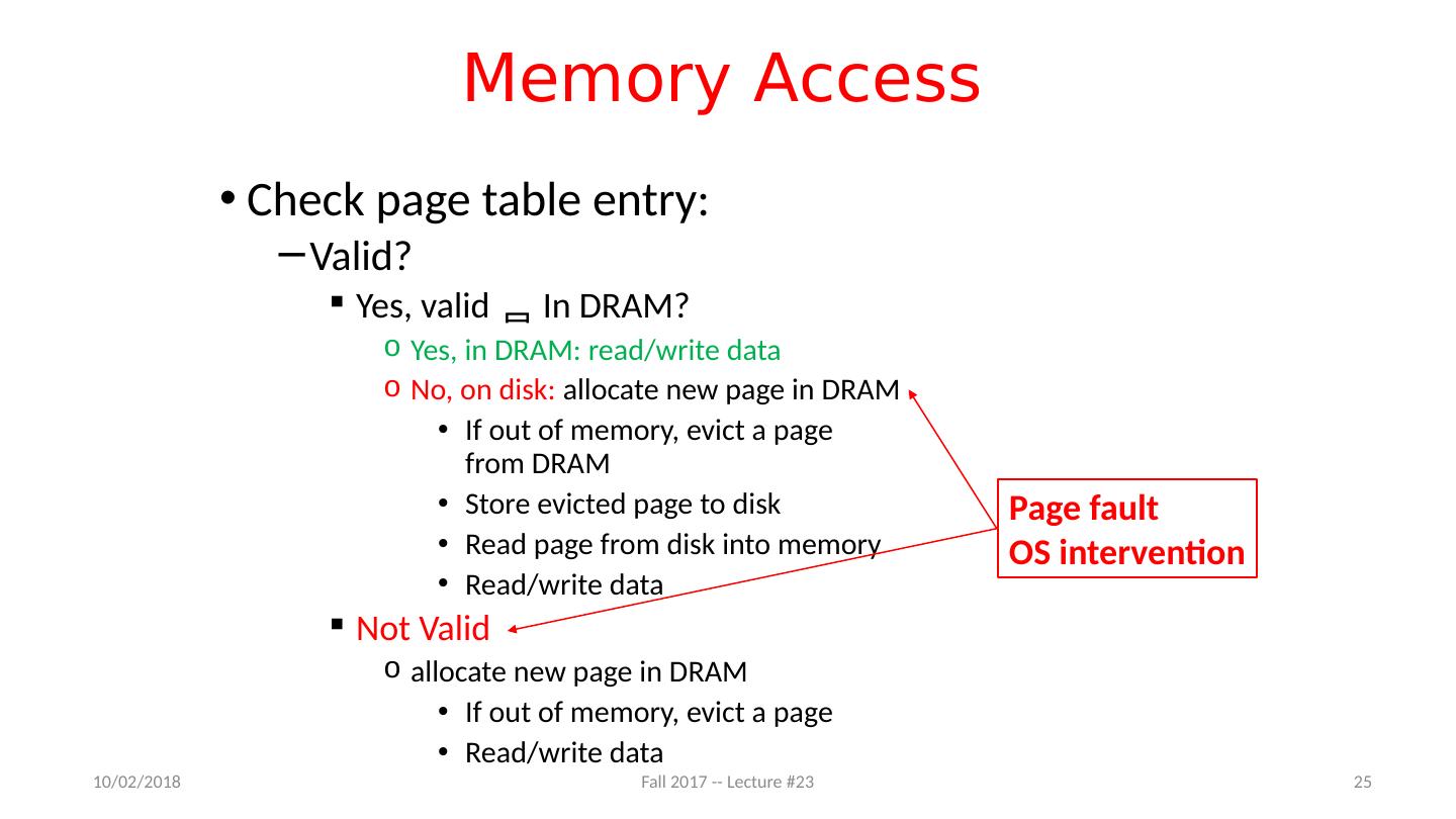 25 .Memory Access Check page table entry: Valid? Yes, valid In DRAM? Yes, in DRAM: read/write data No, on disk: allocate new page in DRAM If out of memory, evict a page from DRAM Store evicted page to disk Read page from disk into memory Read/write data Not Valid allocate new page in DRAM If out of memory, evict a page Read/write data Page fault OS intervention 25 Fall 2017 -- Lecture #23 11/15/17
