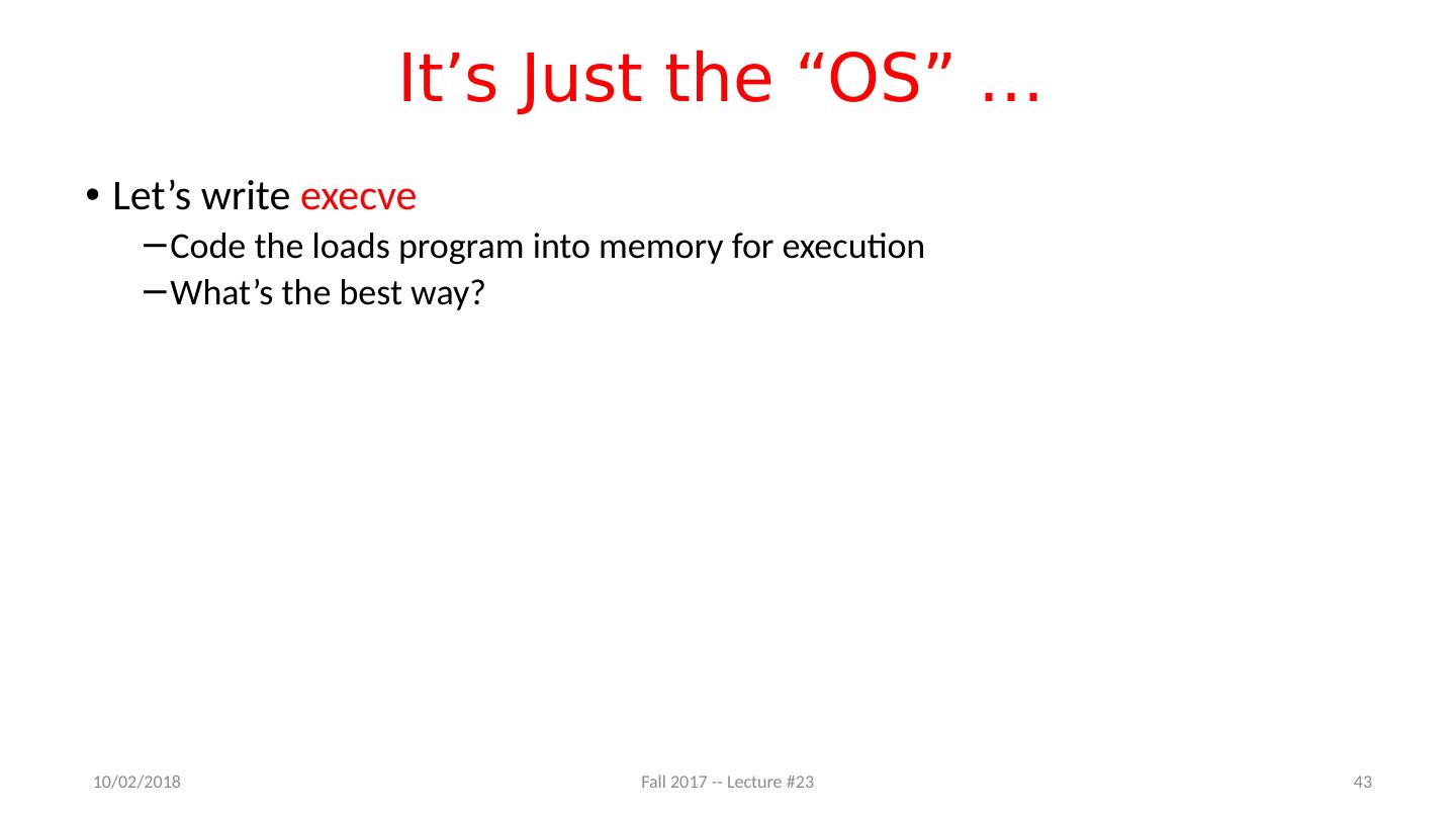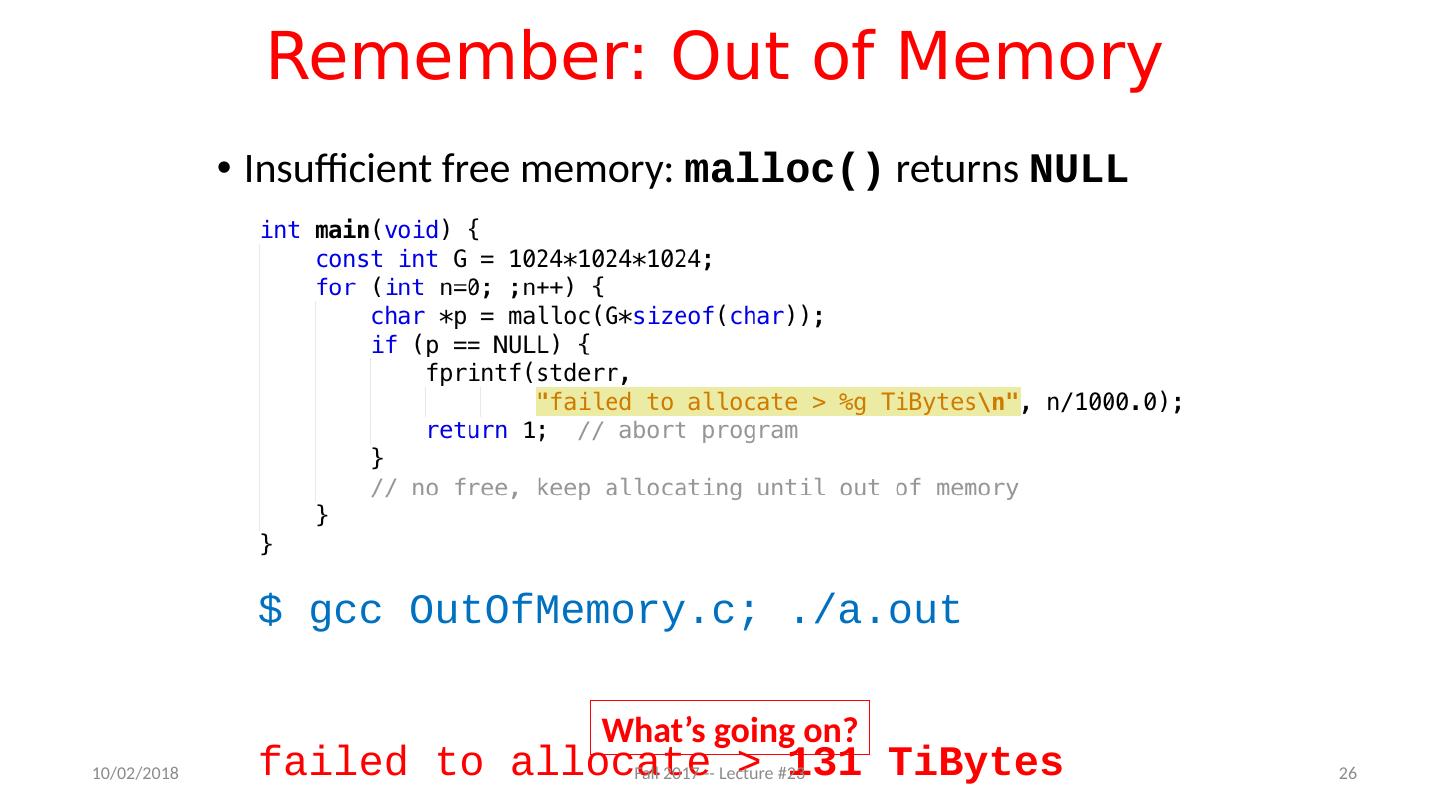 26 .Remember: Out of Memory Insufficient free memory: malloc() returns NULL $ gcc OutOfMemory.c ; ./ a.out failed to allocate > 131 TiBytes What’s going on? 26 Fall 2017 -- Lecture #23 11/15/17