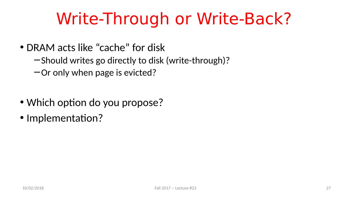 27 .Write-Through or Write-Back? DRAM acts like “cache” for disk Should writes go directly to disk (write-through)? Or only when page is evicted? Which option do you propose? Implementation? 27 Fall 2017 -- Lecture #23 11/15/17