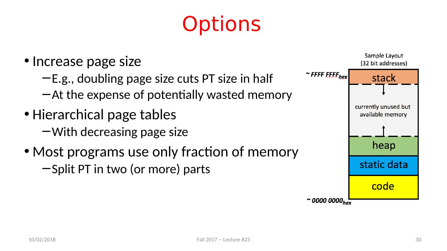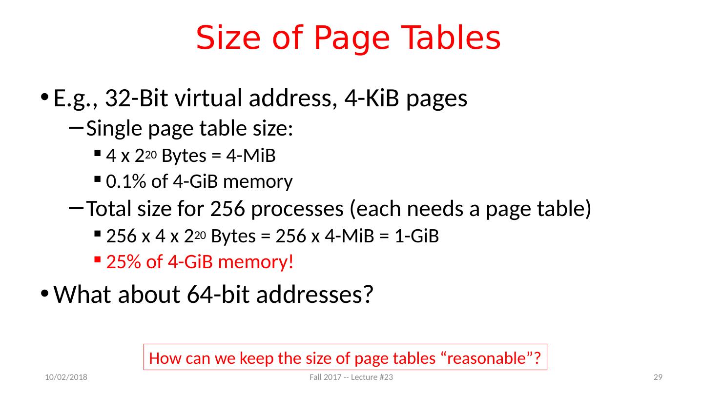 29 .Size of Page Tables E.g., 32-Bit virtual address, 4-KiB pages Single page table size: 4 x 2 20 Bytes = 4-MiB 0.1% of 4-GiB memory Total size for 256 processes (each needs a page table) 256 x 4 x 2 20 Bytes = 256 x 4-MiB = 1-GiB 25% of 4-GiB memory! What about 64-bit addresses? How can we keep the size of page tables “reasonable”? 29 Fall 2017 -- Lecture #23 11/15/17