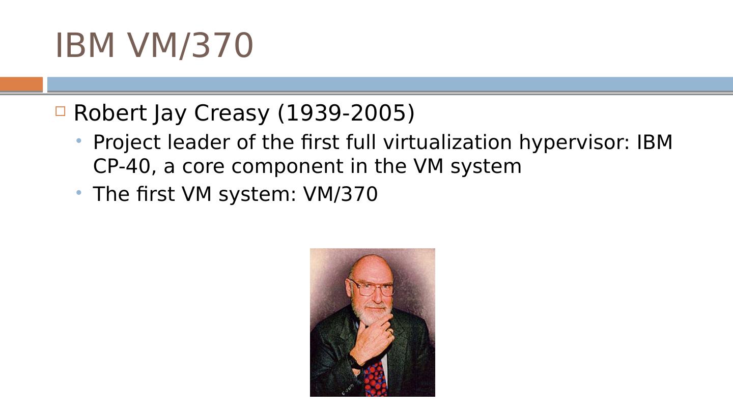 2 .IBM VM/370 Robert Jay Creasy (1939-2005) Project leader of the first full virtualization hypervisor: IBM CP-40, a core component in the VM system The first VM system: VM/370