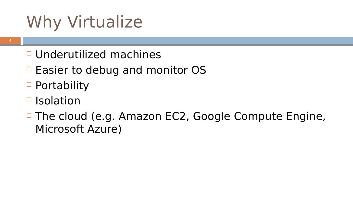 4 .Why Virtualize 4 Underutilized machines Easier to debug and monitor OS Portability Isolation The cloud (e.g. Amazon EC2, Google Compute Engine, Microsoft Azure)