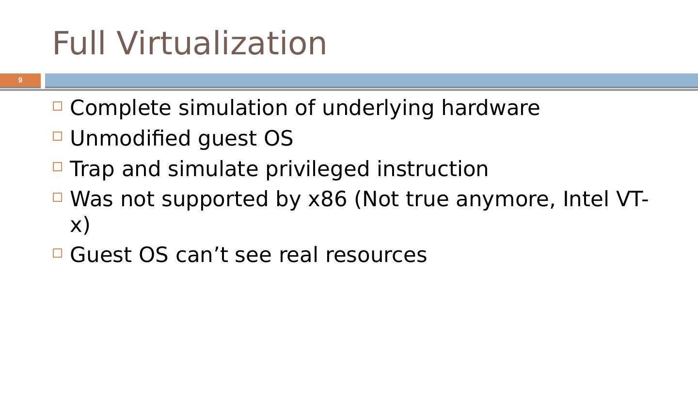 9 .Full Virtualization 9 Complete simulation of underlying hardware Unmodified guest OS Trap and simulate privileged instruction Was not supported by x86 (Not true anymore, Intel VT-x) Guest OS can’t see real resources