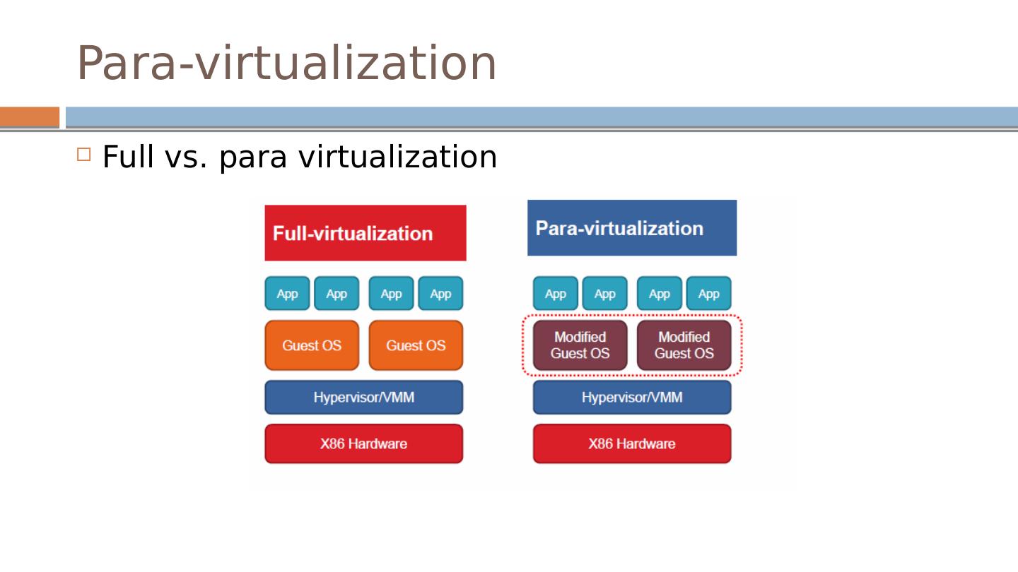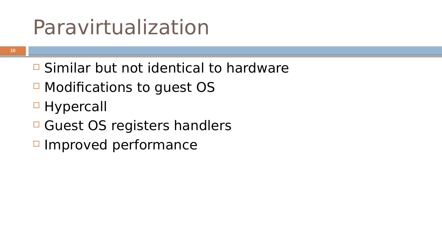 10 .Paravirtualization 10 Similar but not identical to hardware Modifications to guest OS Hypercall Guest OS registers handlers Improved performance