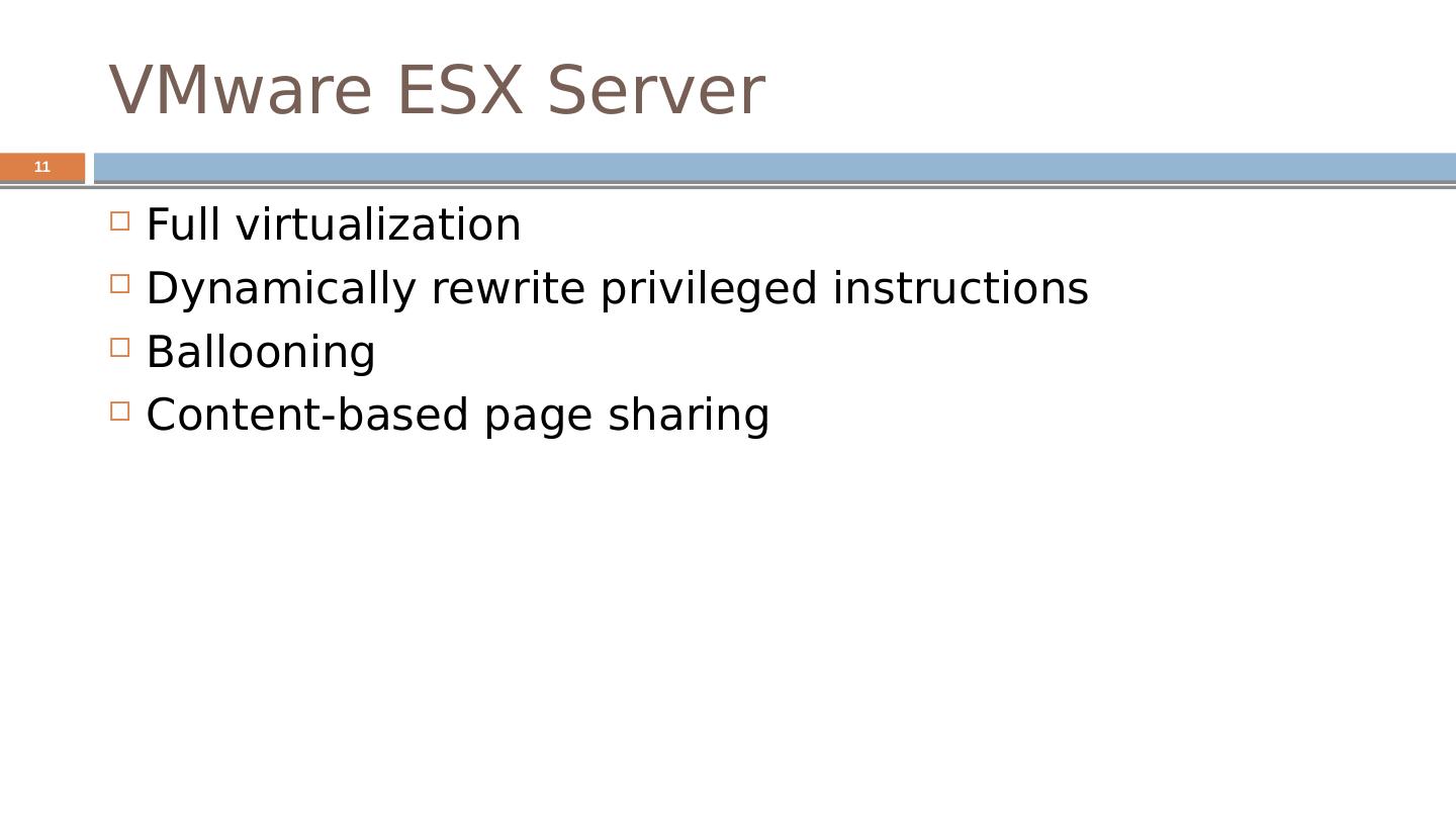 11 .VMware ESX Server 11 Full virtualization Dynamically rewrite privileged instructions Ballooning Content-based page sharing
