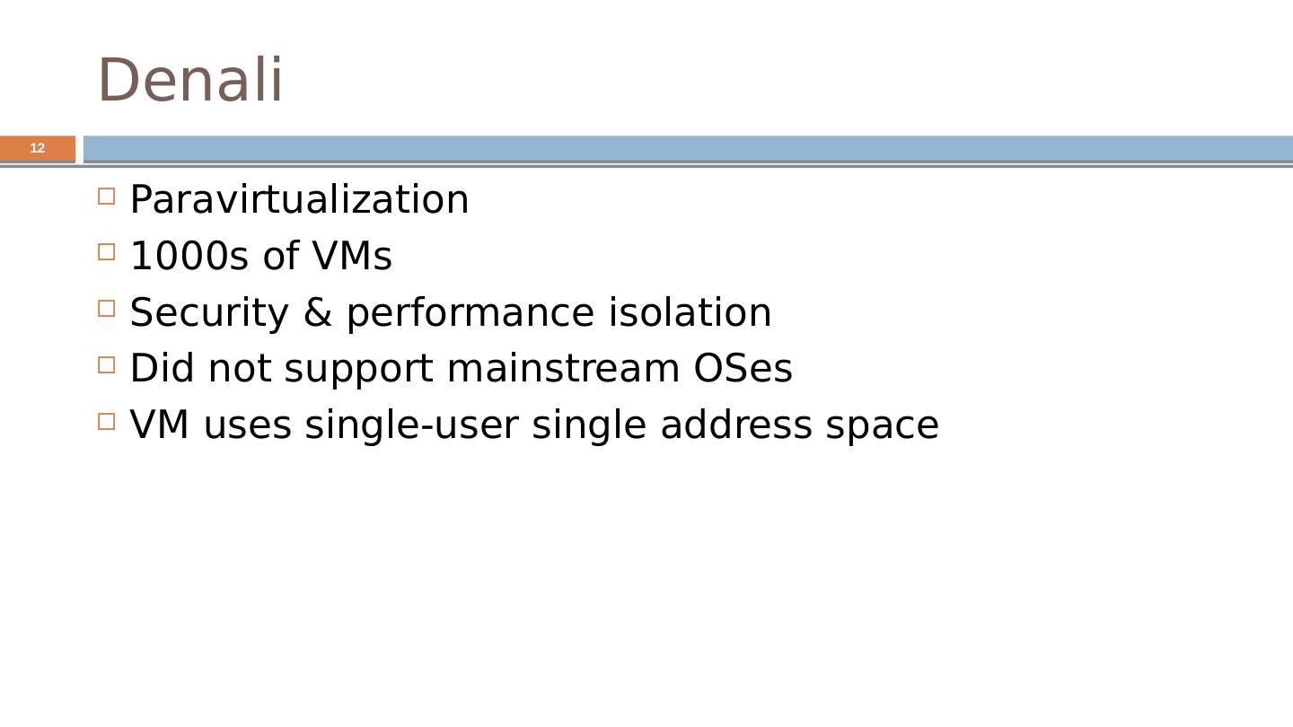 12 .Denali 12 Paravirtualization 1000s of VMs Security & performance isolation Did not support mainstream OSes VM uses single-user single address space