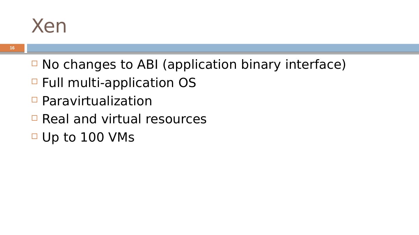 16 .Xen 16 No changes to ABI (application binary interface) Full multi-application OS Paravirtualization Real and virtual resources Up to 100 VMs