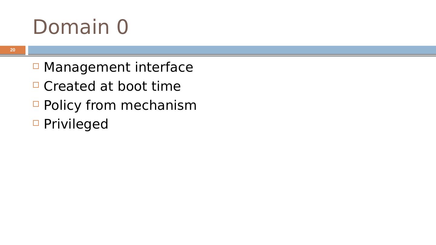 20 .Domain 0 20 Management interface Created at boot time Policy from mechanism Privileged