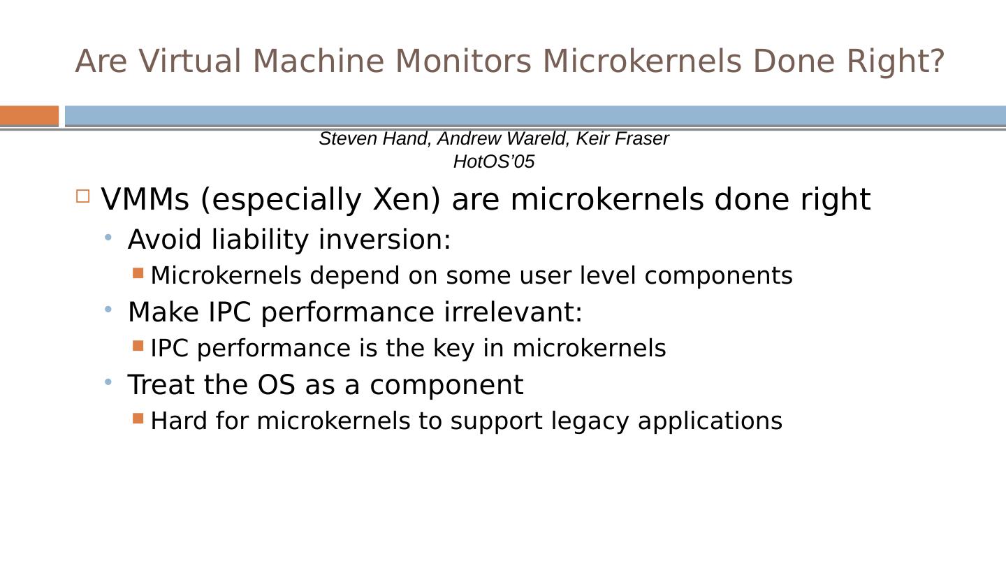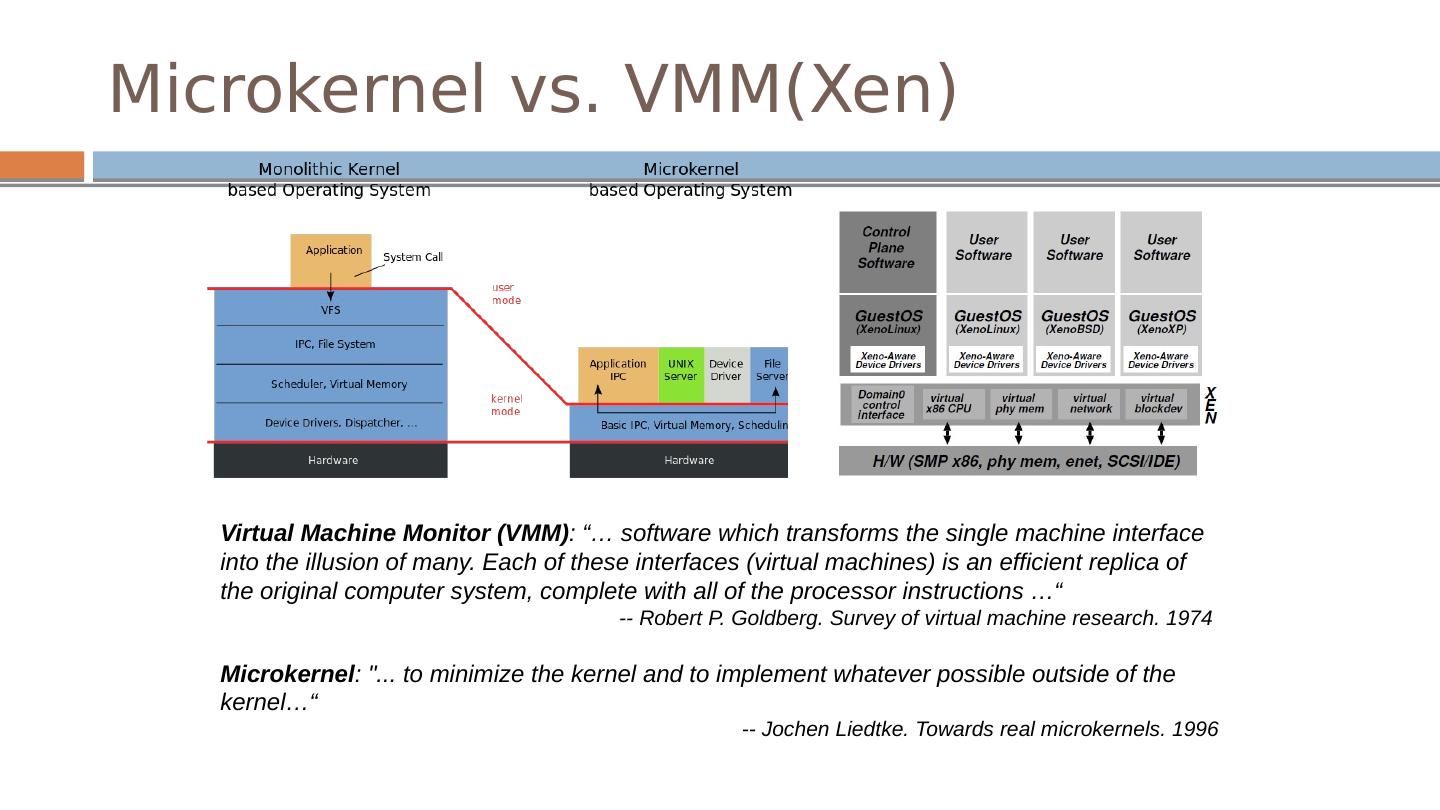 22 .Interface: Memory Management 22 Guest OSes manage their own page tables Register pages with Xen No direct write access Updates through Xen Hypervisor @ top 64MB of every address space 2018: security issues with Meltdown/ Spectre