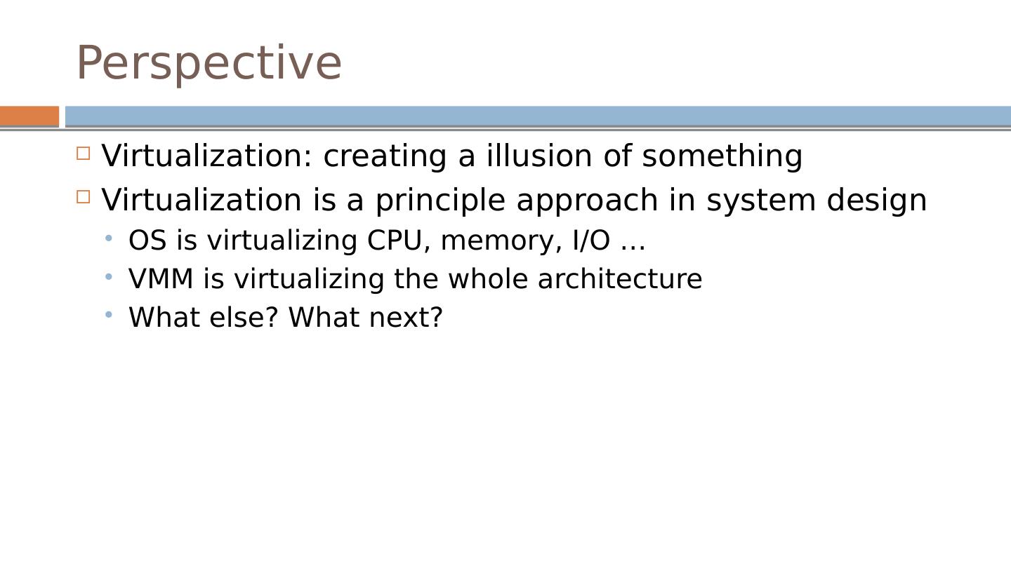 29 .Conclusion x86 architecture makes virtualization challenging Full virtualization unmodified guest OS; good isolation Performance issue (especially I/O) Para virtualization: Better performance (potentially) Need to update guest kernel Full and para virtualization will keep evolving together