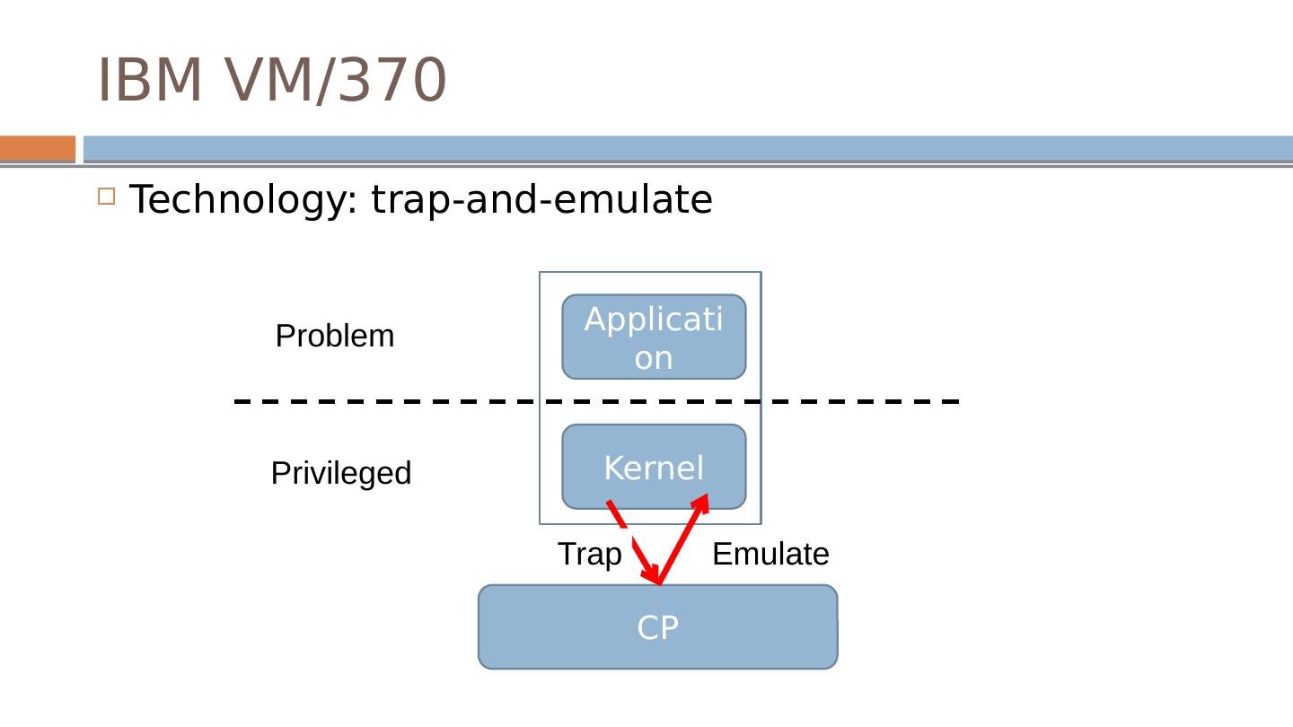 6 .IBM VM/370 Technology: trap-and-emulate Kernel Application Privileged Problem CP Trap Emulate