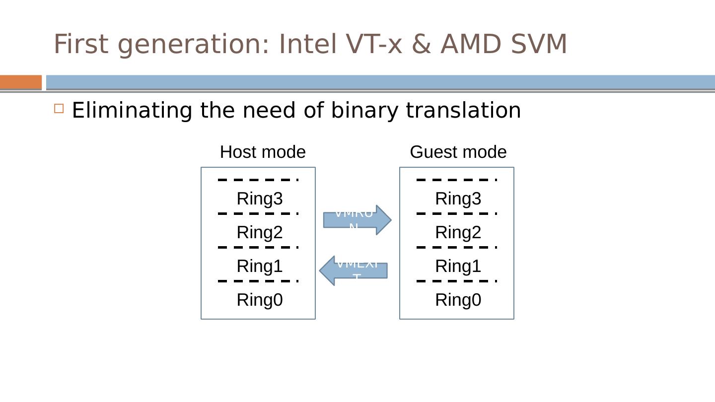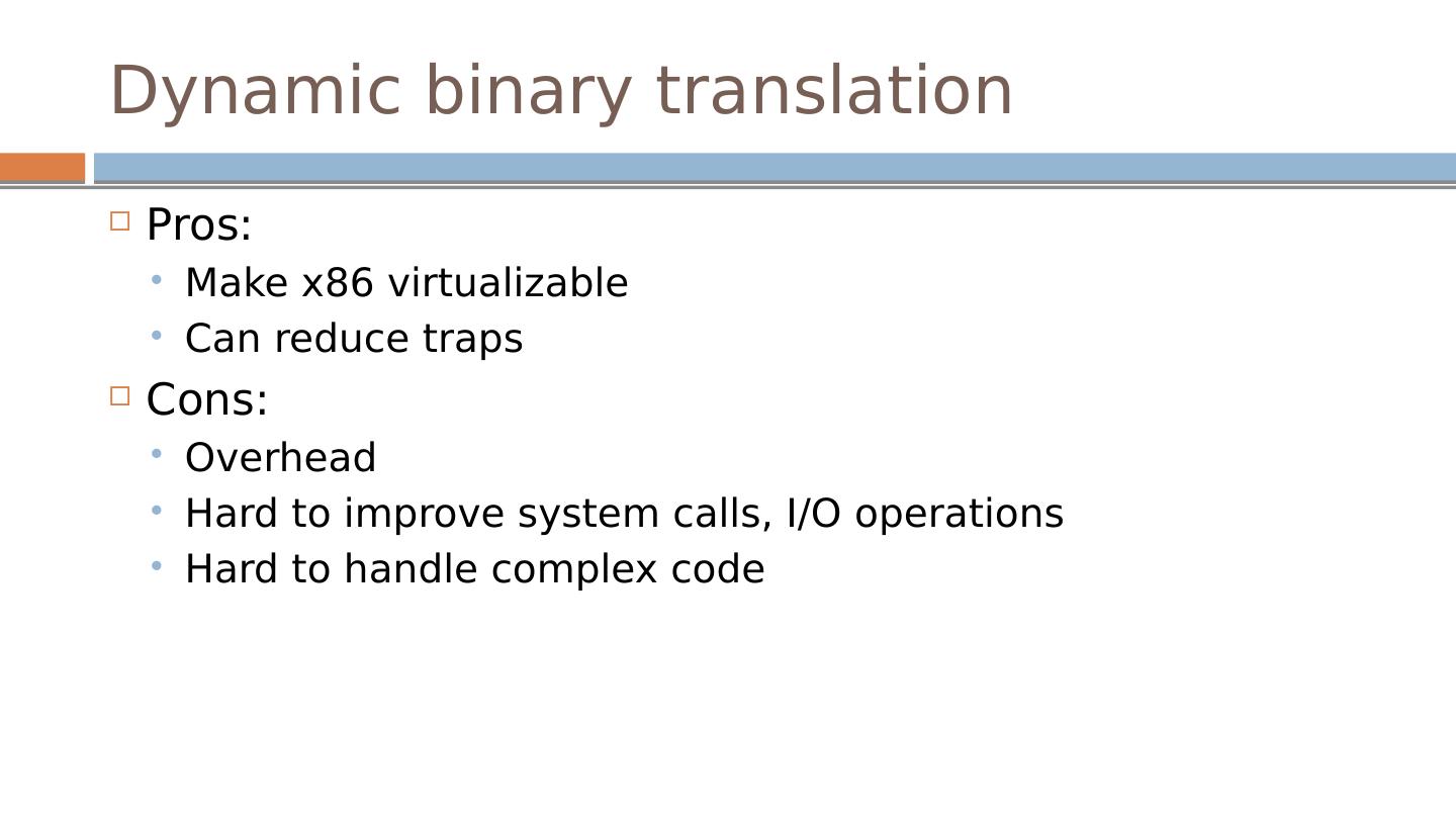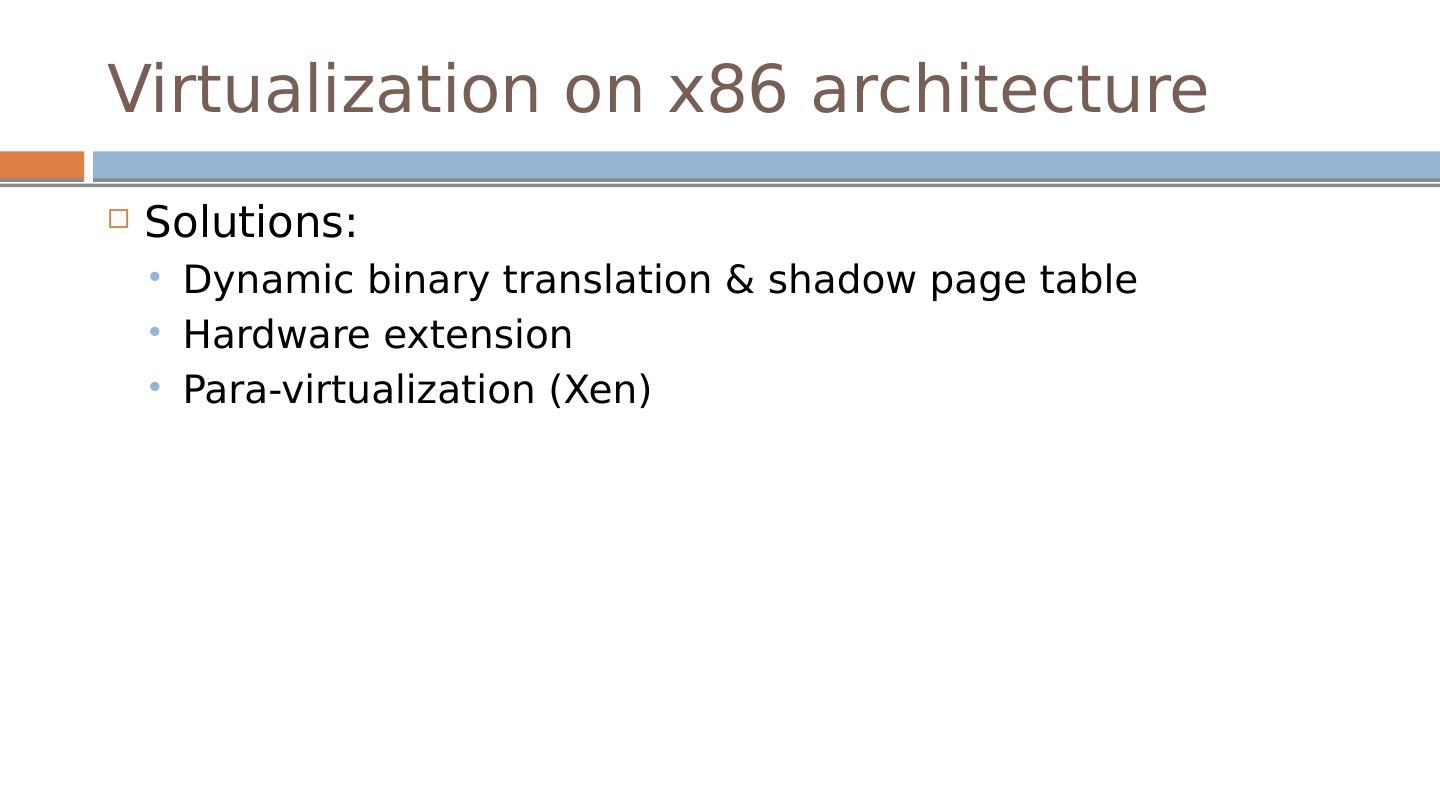 17 .Virtualization on x86 architecture Challenges: Virtualization on x86 architecture Correctness: not all privileged instructions produce traps! Example: popf Performance: System calls: traps in both enter and exit (10X) I/O performance: high CPU overhead Virtual memory: no software-controlled TLB