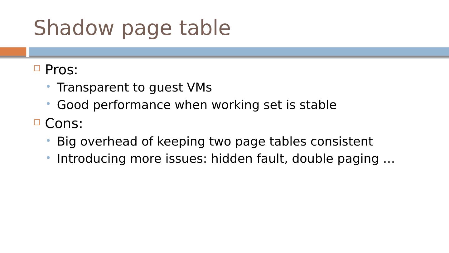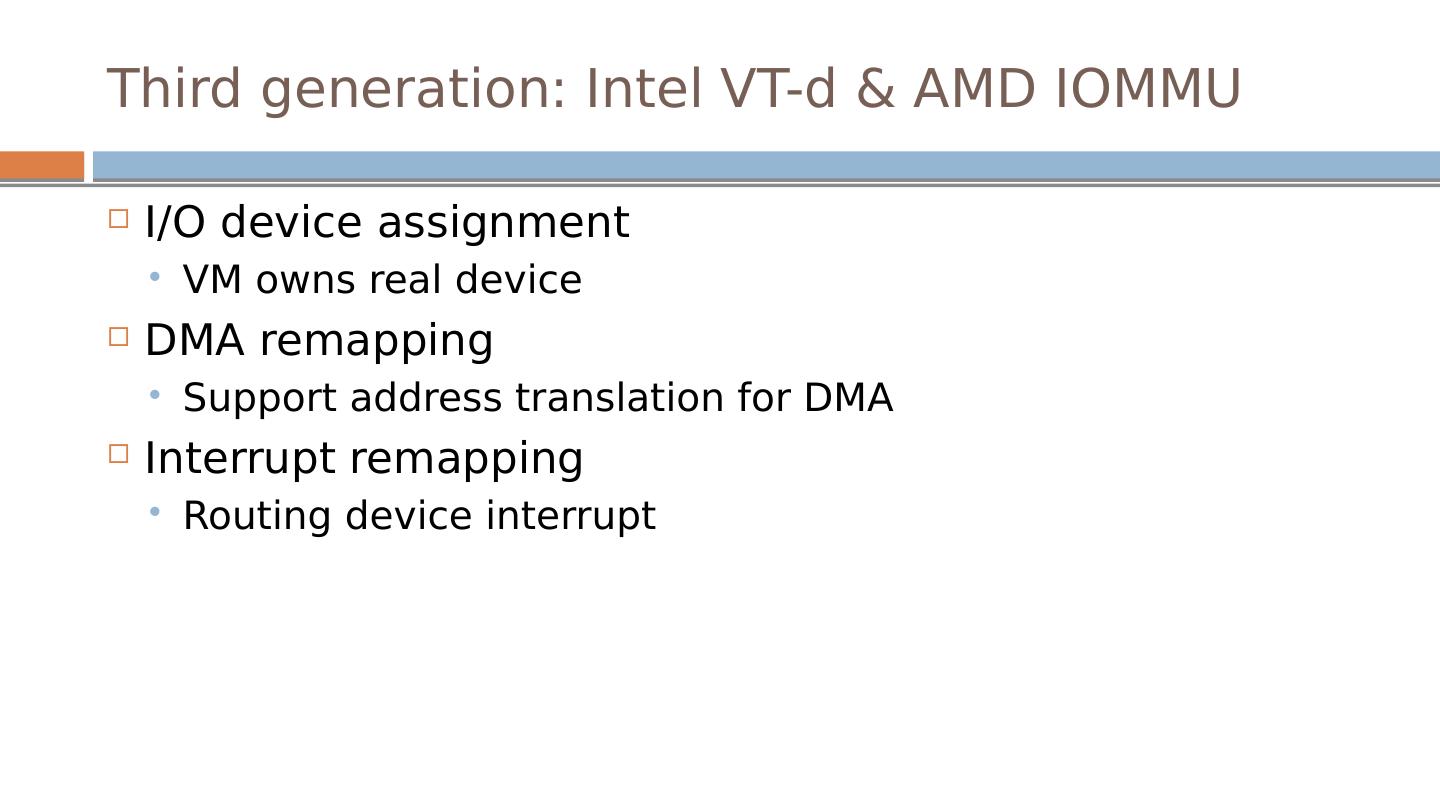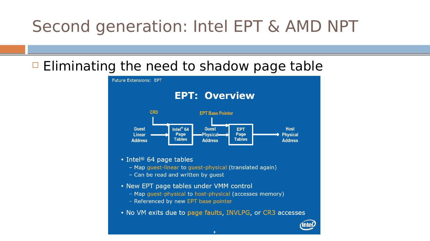 17 .Virtualization on x86 architecture Challenges: Virtualization on x86 architecture Correctness: not all privileged instructions produce traps! Example: popf Performance: System calls: traps in both enter and exit (10X) I/O performance: high CPU overhead Virtual memory: no software-controlled TLB