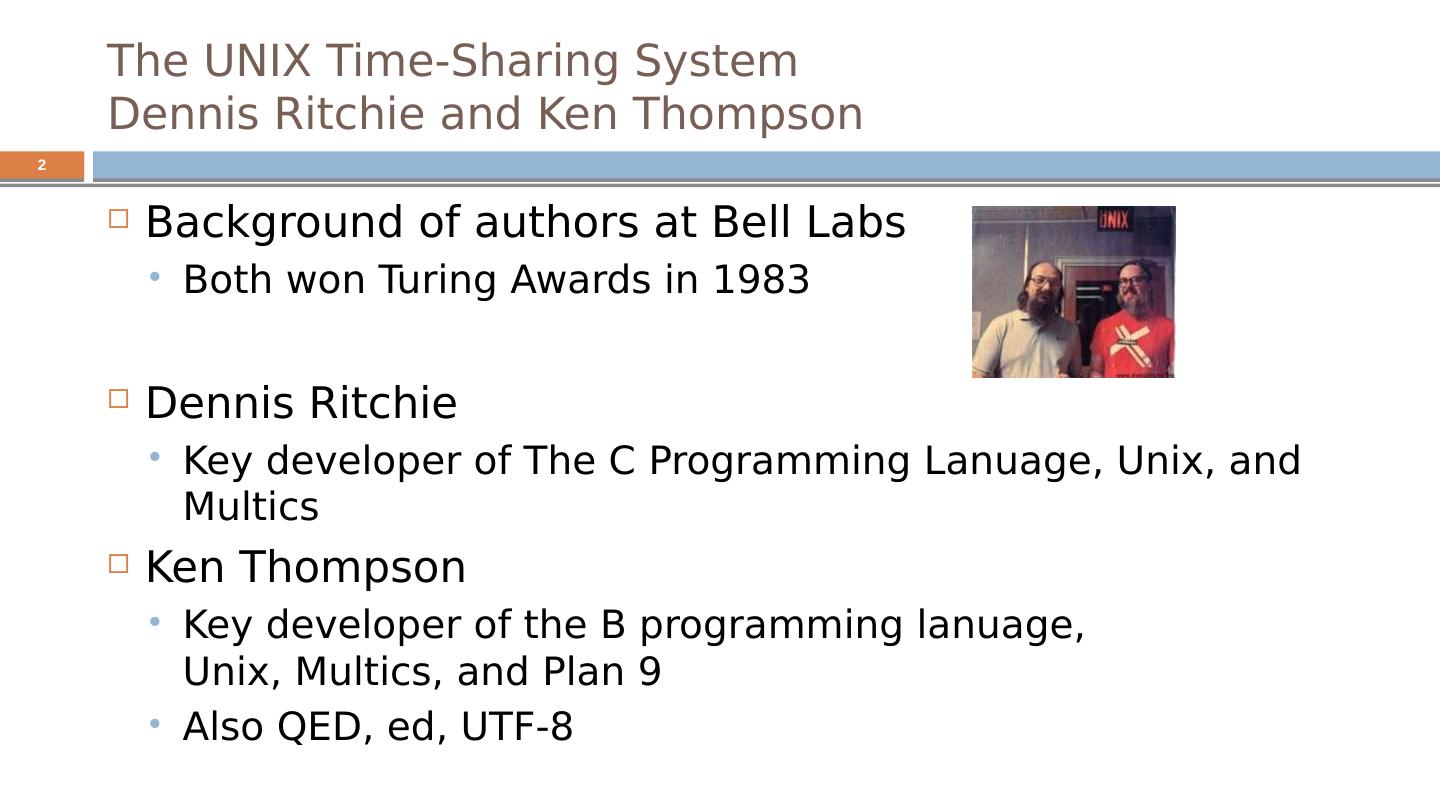 2 .The UNIX Time-Sharing System Dennis Ritchie and Ken Thompson Background of authors at Bell Labs Both won Turing Awards in 1983 Dennis Ritchie Key developer of The C Programming Lanuage, Unix, and Multics Ken Thompson Key developer of the B programming lanuage, Unix, Multics, and Plan 9 Also QED, ed, UTF-8 2