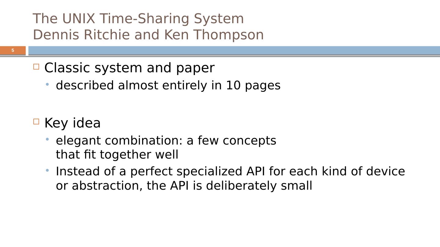 5 .The UNIX Time-Sharing System Dennis Ritchie and Ken Thompson Classic system and paper described almost entirely in 10 pages Key idea elegant combination: a few concepts that fit together well Instead of a perfect specialized API for each kind of device or abstraction, the API is deliberately small 5