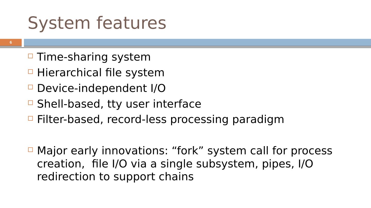 6 .System features Time-sharing system Hierarchical file system Device-independent I/O Shell-based, tty user interface Filter-based, record-less processing paradigm Major early innovations: “fork” system call for process creation, file I/O via a single subsystem, pipes, I/O redirection to support chains 6