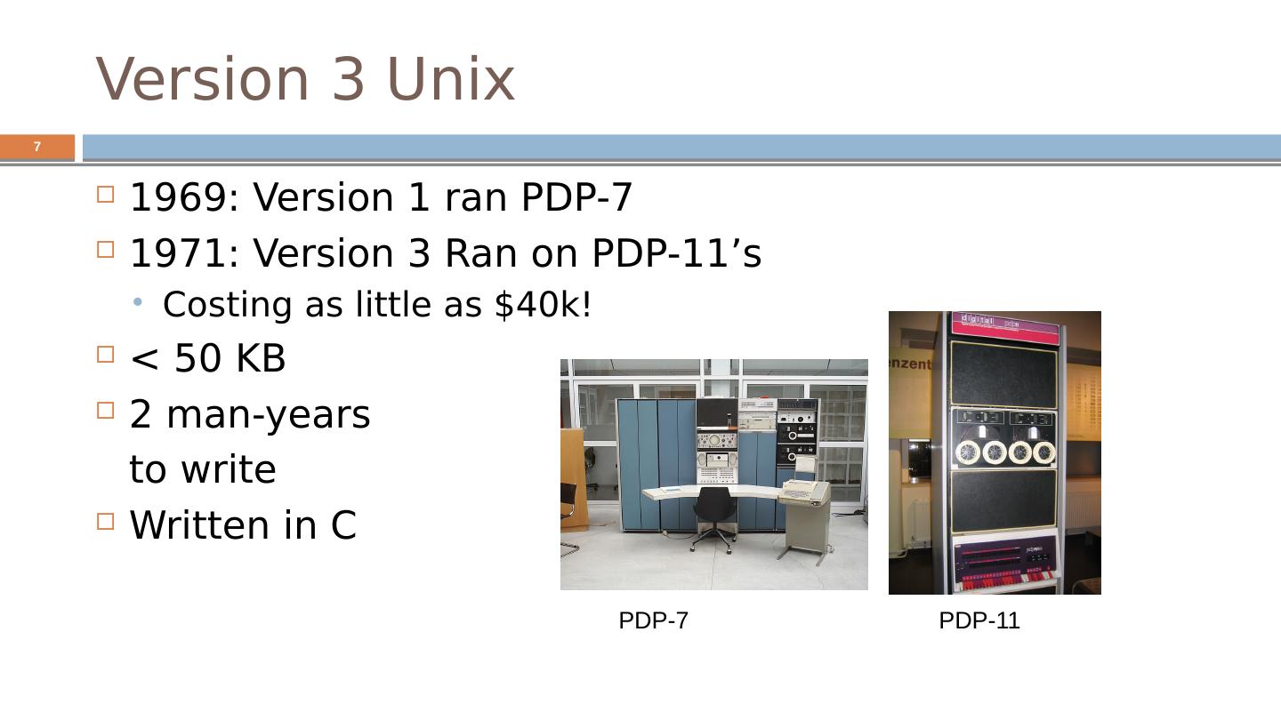 7 .Version 3 Unix 1969: Version 1 ran PDP-7 1971: Version 3 Ran on PDP-11’s Costing as little as $40k! < 50 KB 2 man-years to write Written in C PDP-7 PDP-11 7