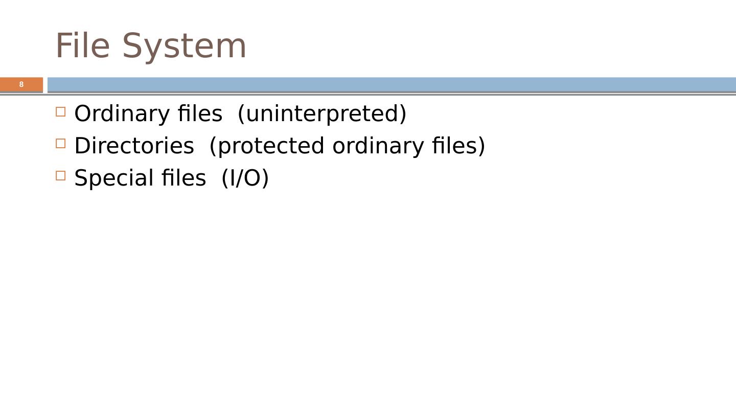8 .File System Ordinary files ( uninterpreted ) Directories (protected ordinary files) Special files (I/O) 8