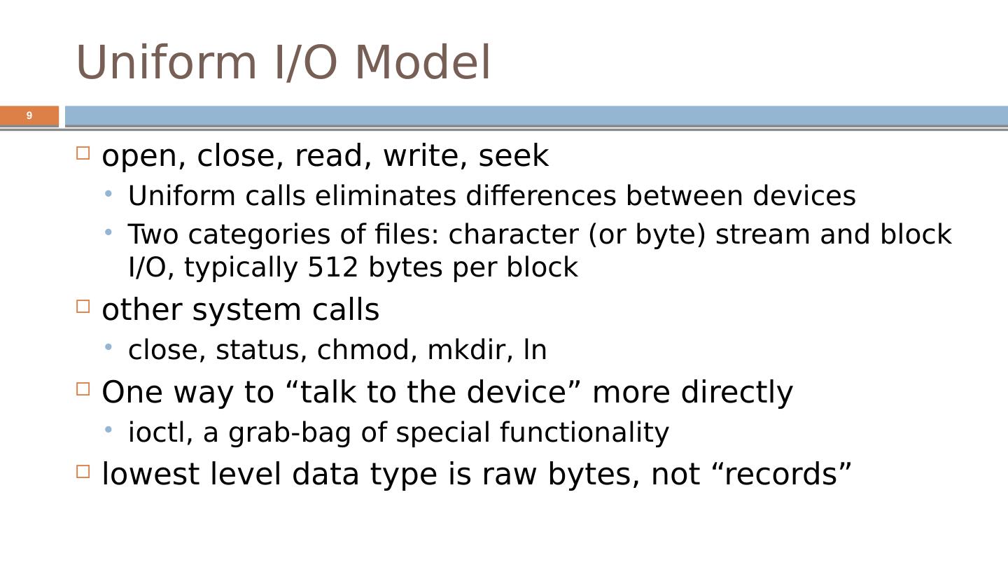 9 .Uniform I/O Model open, close, read, write, seek Uniform calls eliminates differences between devices Two categories of files: character (or byte) stream and block I/O, typically 512 bytes per block other system calls close, status, chmod , mkdir , ln One way to “talk to the device” more directly ioctl , a grab-bag of special functionality lowest level data type is raw bytes, not “records” 9