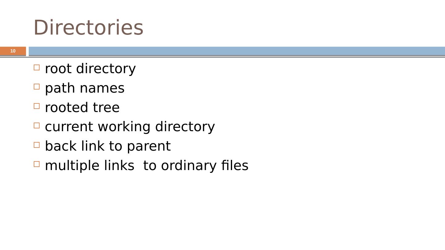 10 .Directories root directory path names rooted tree current working directory back link to parent multiple links to ordinary files 10