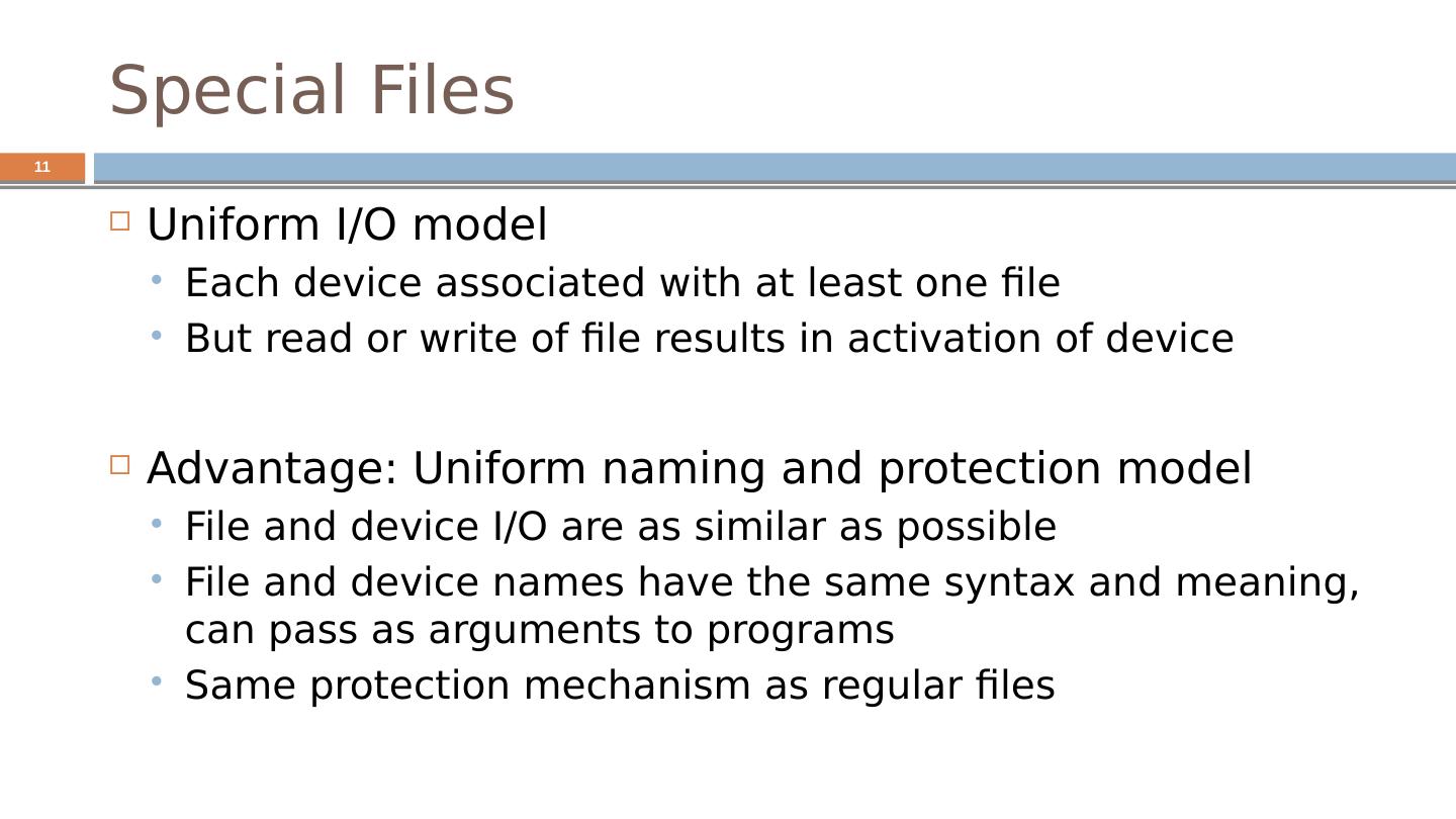 11 .Special Files Uniform I/O model Each device associated with at least one file But read or write of file results in activation of device Advantage: Uniform naming and protection model File and device I/O are as similar as possible File and device names have the same syntax and meaning, can pass as arguments to programs Same protection mechanism as regular files 11