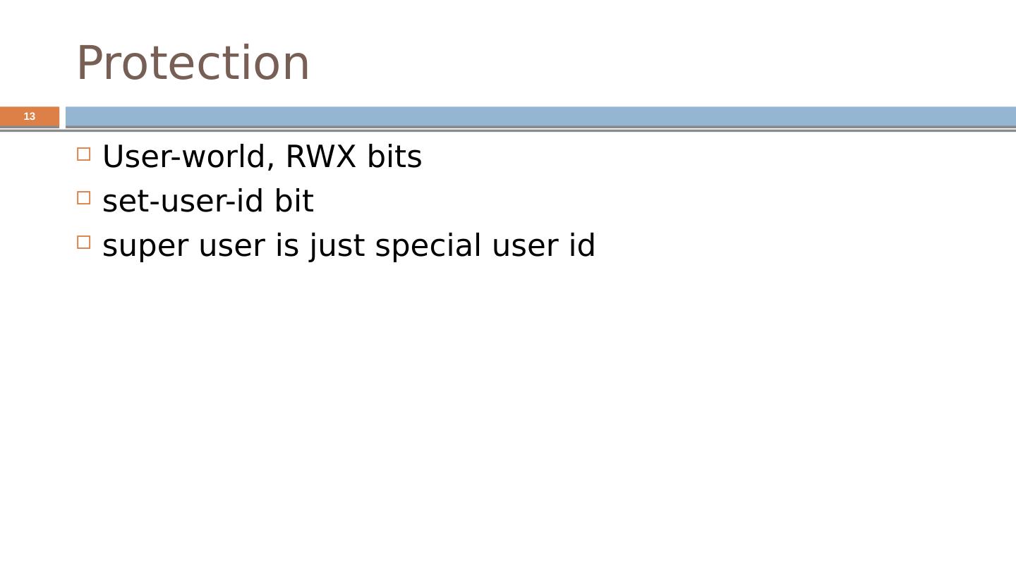 13 .Protection User-world, RWX bits set-user-id bit super user is just special user id 13
