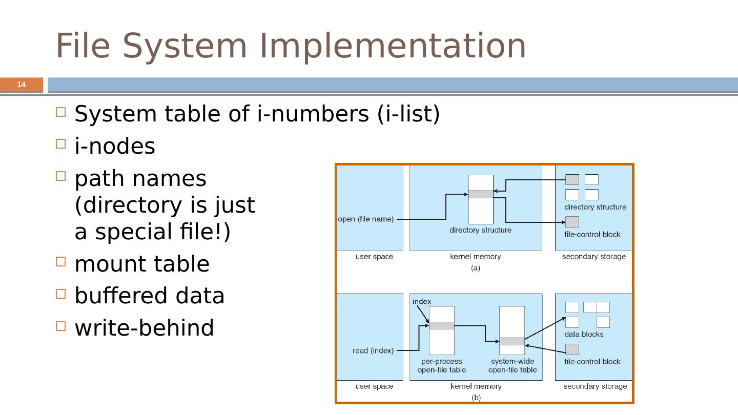 14 .File System Implementation System table of i -numbers ( i -list) i -nodes path names (directory is just a special file!) mount table buffered data write-behind 14