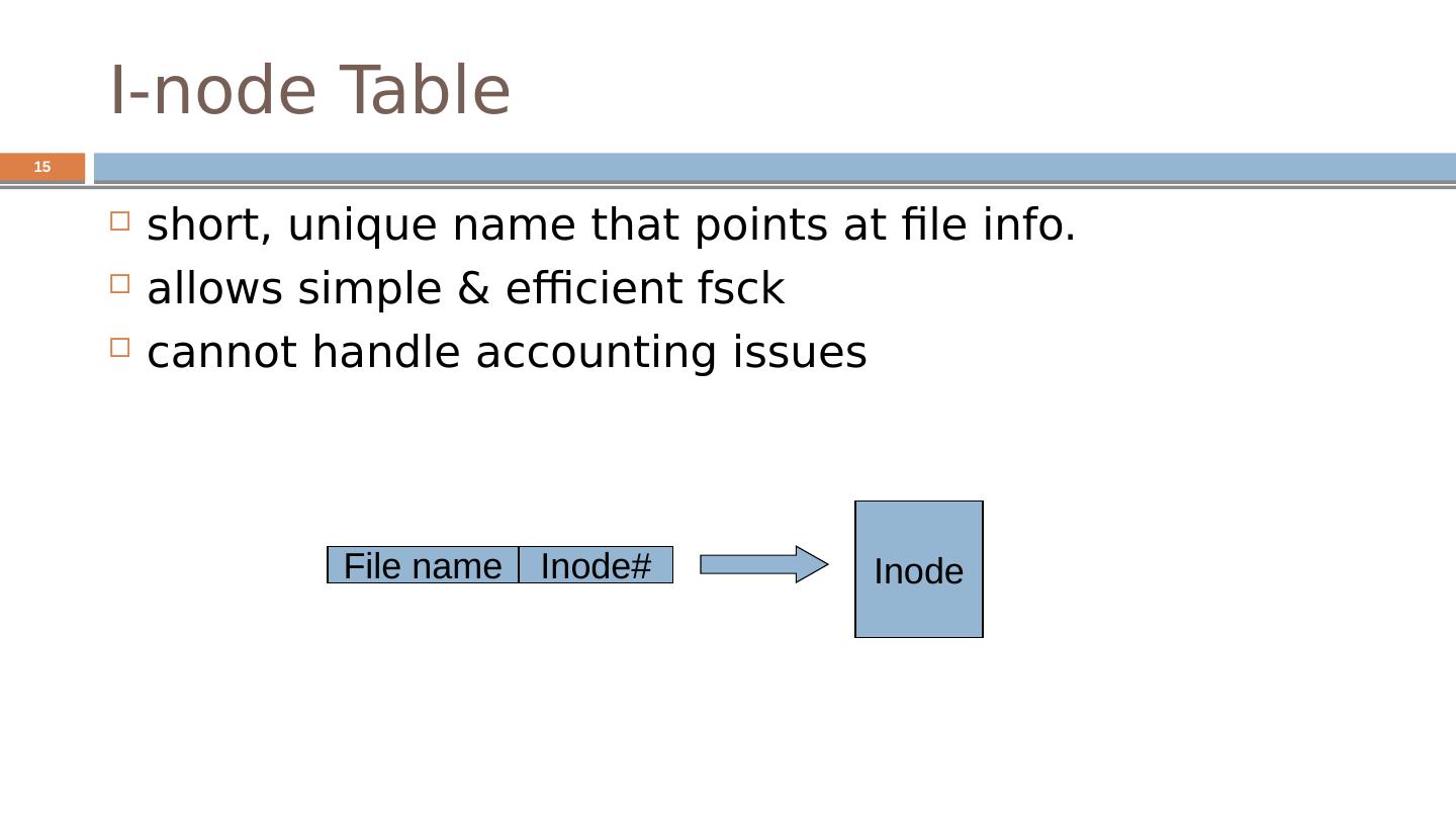 15 .I-node Table short, unique name that points at file info. allows simple & efficient fsck cannot handle accounting issues File name Inode# Inode 15