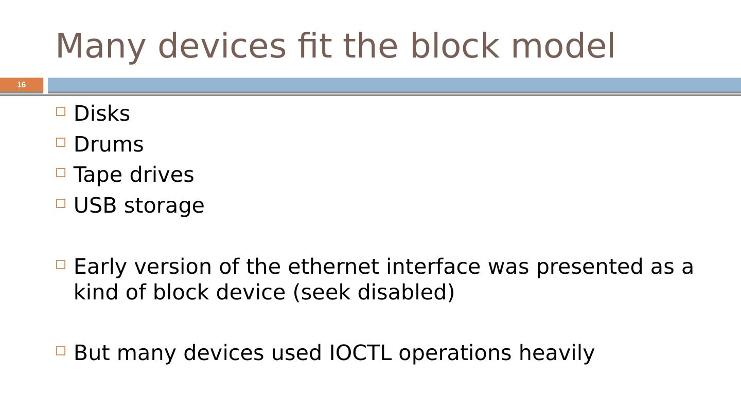 16 .Many devices fit the block model Disks Drums Tape drives USB storage Early version of the ethernet interface was presented as a kind of block device (seek disabled) But many devices used IOCTL operations heavily 16