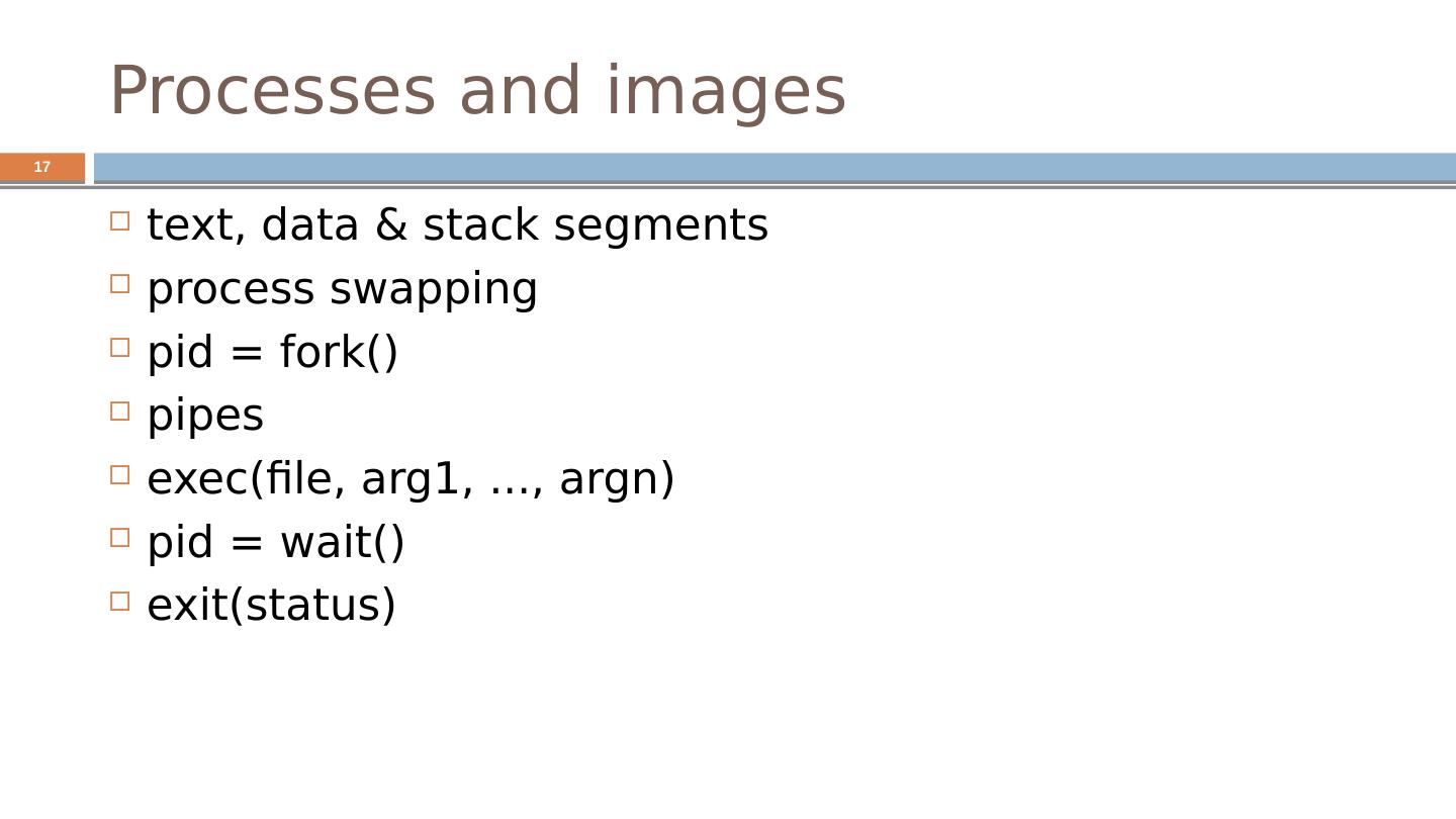 17 .Processes and images text, data & stack segments process swapping pid = fork() pipes exec(file , arg1, ..., argn ) pid = wait() exit(status ) 17