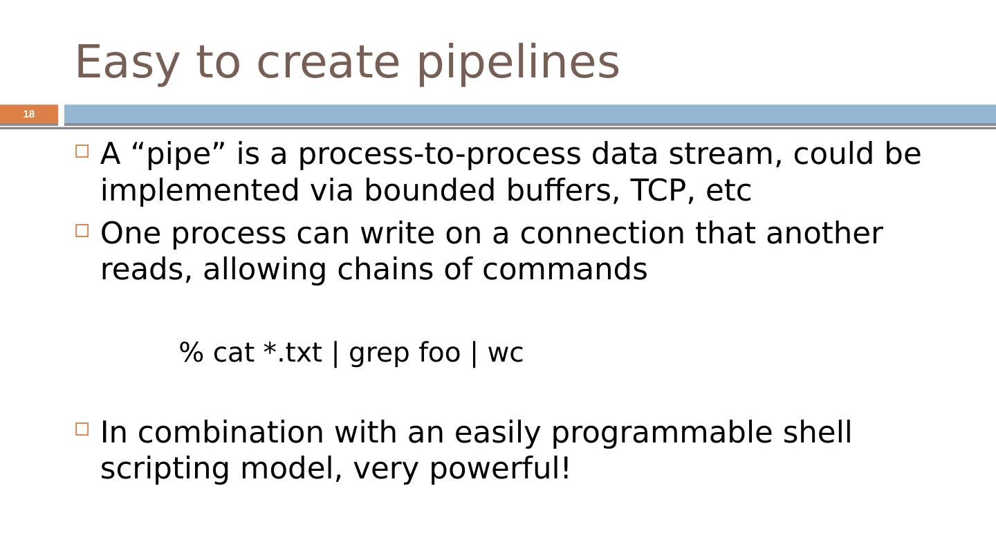 18 .Easy to create pipelines A “pipe” is a process-to-process data stream, could be implemented via bounded buffers, TCP, etc One process can write on a connection that another reads, allowing chains of commands % cat *.txt | grep foo | wc In combination with an easily programmable shell scripting model, very powerful! 18