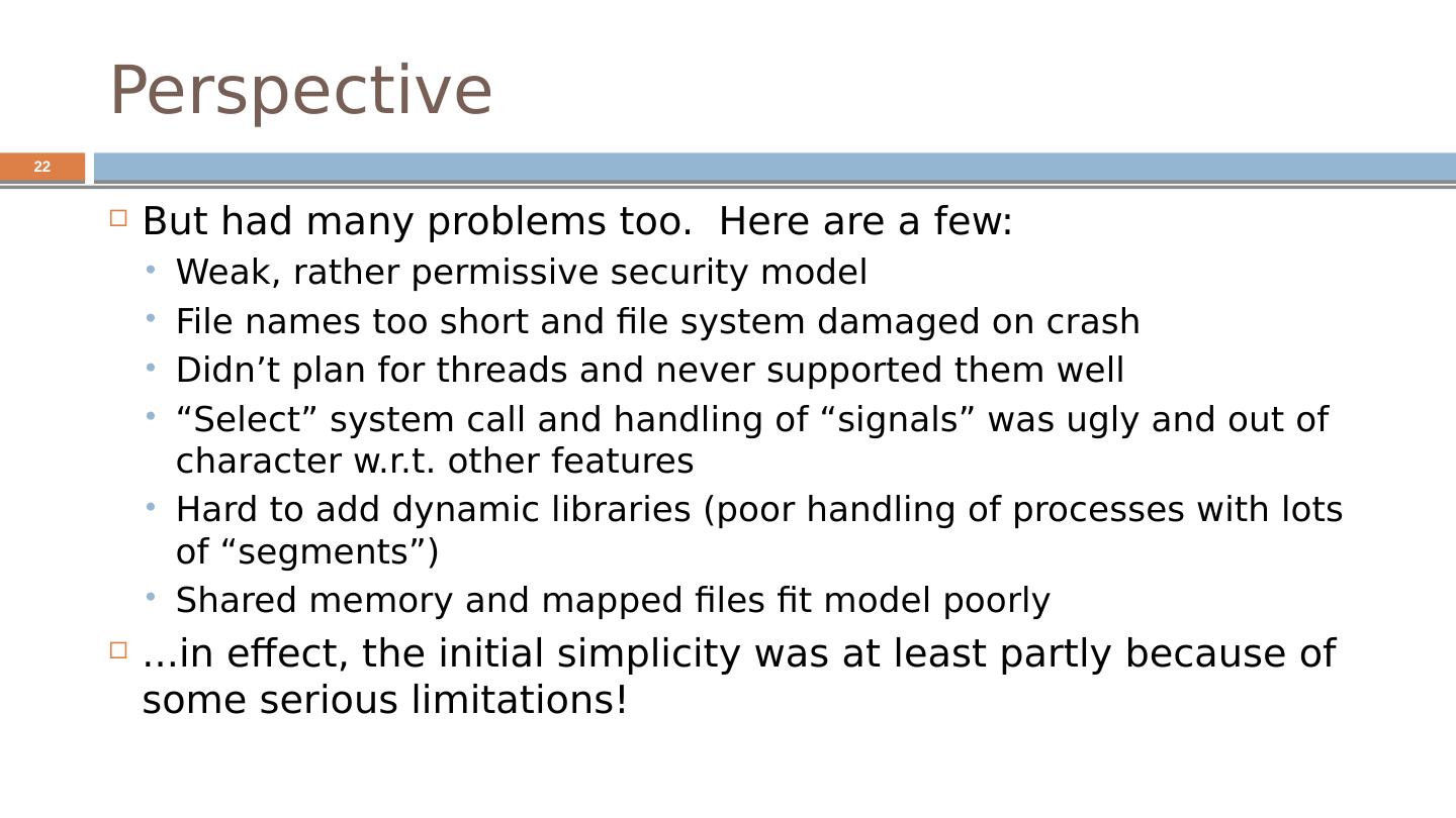 22 .Perspective But had many problems too. Here are a few: Weak, rather permissive security model File names too short and file system damaged on crash Didn’t plan for threads and never supported them well “Select” system call and handling of “signals” was ugly and out of character w.r.t. other features Hard to add dynamic libraries (poor handling of processes with lots of “segments”) Shared memory and mapped files fit model poorly ...in effect, the initial simplicity was at least partly because of some serious limitations! 22
