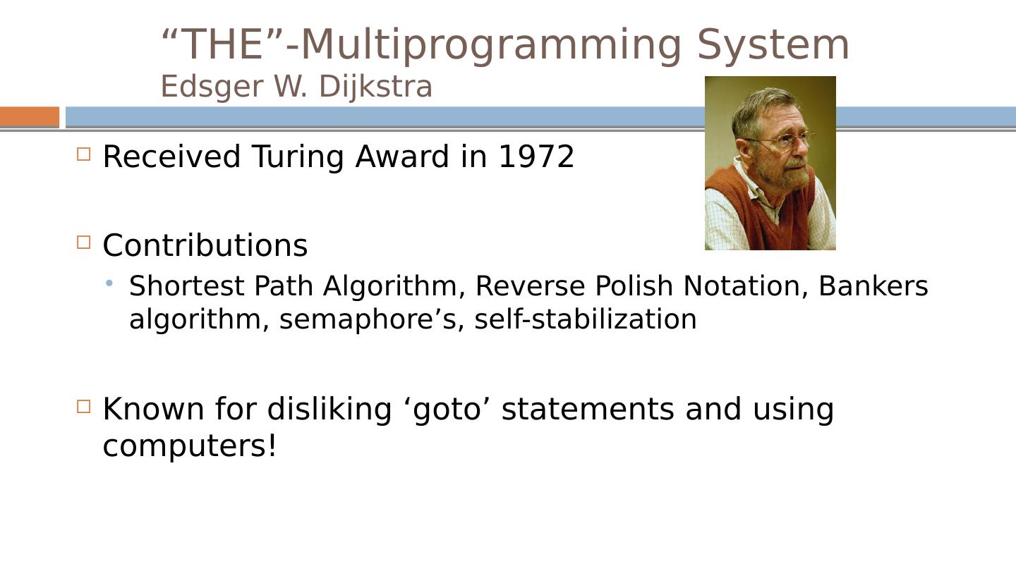 24 .“THE”-Multiprogramming System Edsger W. Dijkstra Received Turing Award in 1972 Contributions Shortest Path Algorithm, Reverse Polish Notation, Bankers algorithm, semaphore’s, self-stabilization Known for disliking ‘ goto ’ statements and using computers!