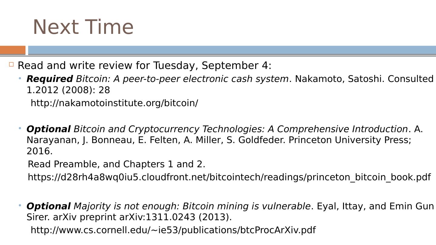 28 .Next Time Read and write review for Tuesday, September 4: Required Bitcoin : A peer-to-peer electronic cash system . Nakamoto , Satoshi. Consulted 1.2012 (2008 ): 28 http ://nakamotoinstitute.org/bitcoin / Optional Bitcoin and Cryptocurrency Technologies: A Comprehensive Introduction . A. Narayanan, J. Bonneau , E. Felten , A. Miller, S. Goldfeder . Princeton University Press; 2016. Read Preamble, and Chapters 1 and 2. https :// d28rh4a8wq0iu5.cloudfront.net/bitcointech/readings/princeton_bitcoin_book.pdf Optional Majority is not enough: Bitcoin mining is vulnerable . Eyal, Ittay , and Emin Gun Sirer. arXiv preprint arXiv:1311.0243 (2013 ). http ://www.cs.cornell.edu/~ie53/publications/btcProcArXiv.pdf