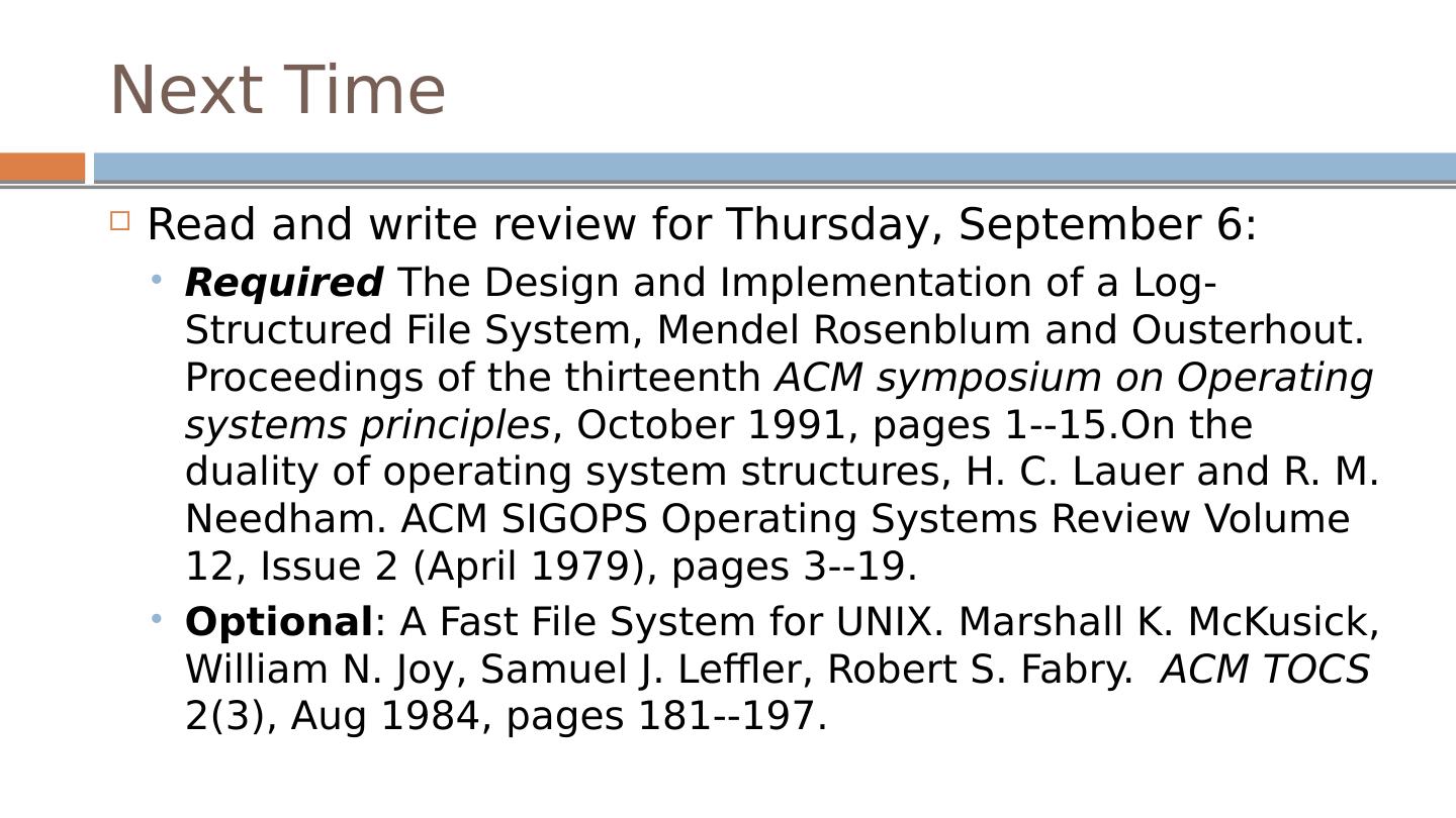 29 .Next Time Read and write review for Thursday, September 6: Required The Design and Implementation of a Log-Structured File System, Mendel Rosenblum and Ousterhout . Proceedings of the thirteenth ACM symposium on Operating systems principles , October 1991, pages 1--15.On the duality of operating system structures, H. C. Lauer and R. M. Needham. ACM SIGOPS Operating Systems Review Volume 12, Issue 2 (April 1979), pages 3--19. Optional : A Fast File System for UNIX. Marshall K. McKusick , William N. Joy, Samuel J. Leffler , Robert S. Fabry . ACM TOCS 2(3), Aug 1984, pages 181--197.