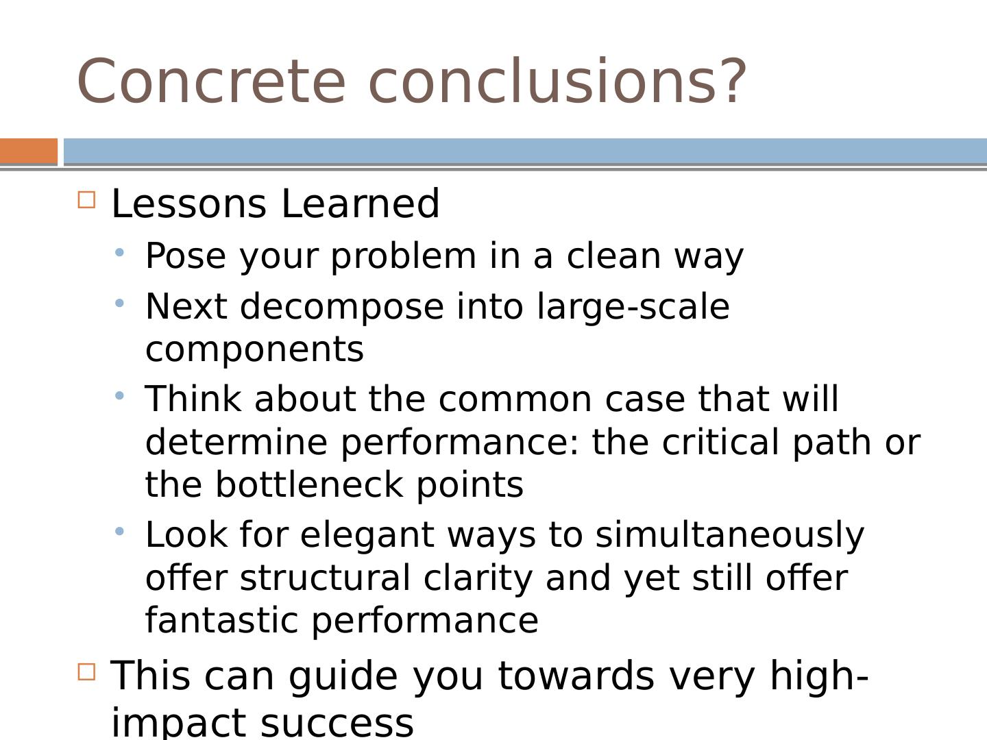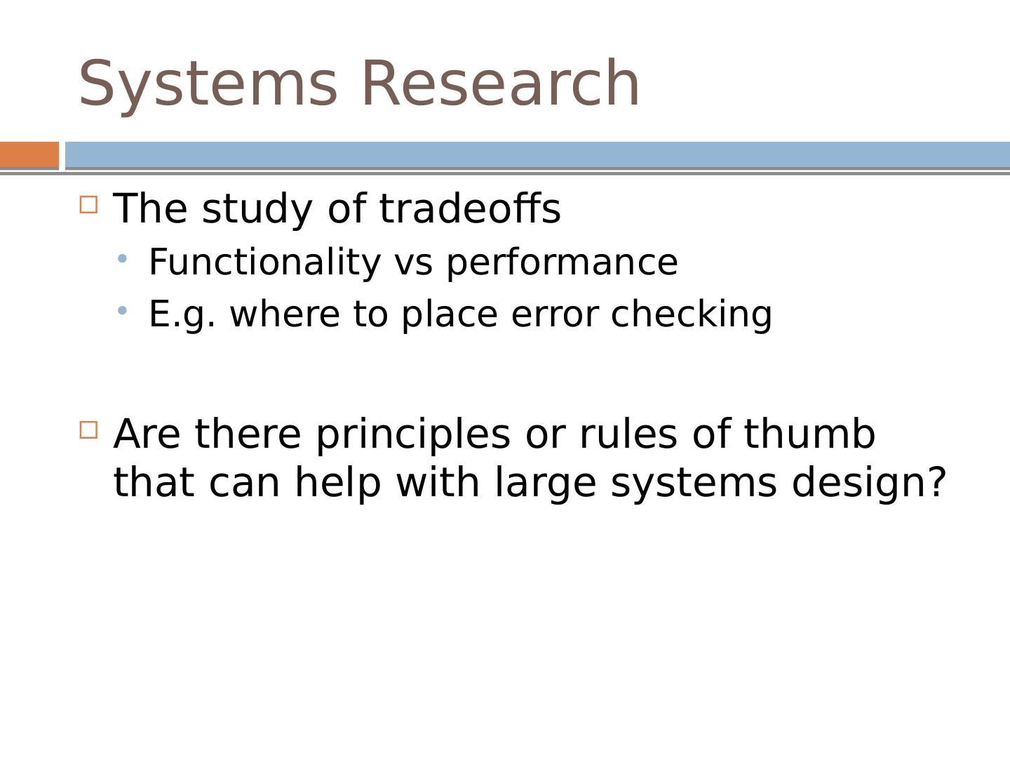 2 .Systems Research The study of tradeoffs Functionality vs performance E.g. where to place error checking Are there principles or rules of thumb that can help with large systems design?