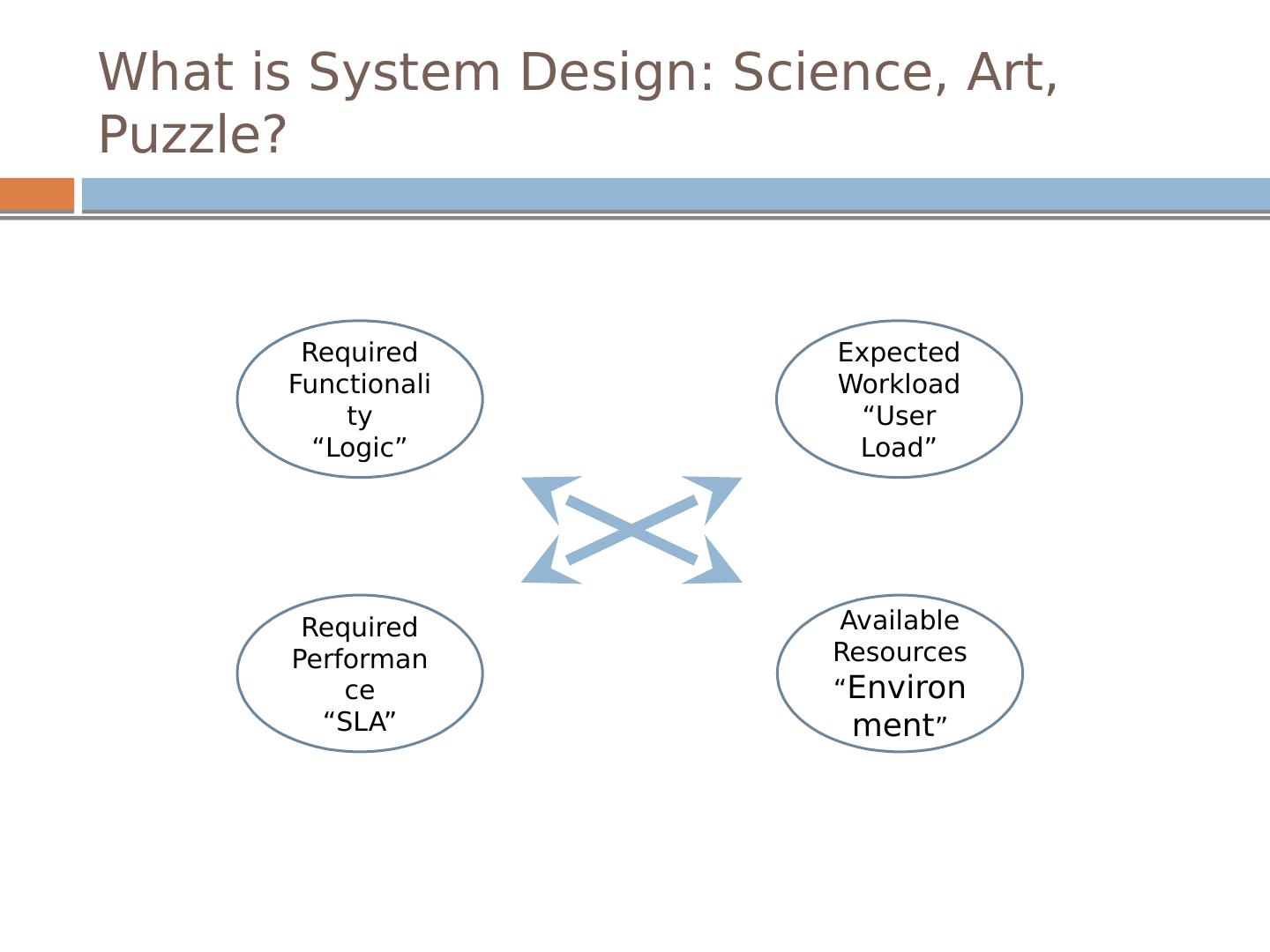 3 .What is System Design: Science, Art, Puzzle? Required Functionality “Logic” Expected Workload “User Load” Required Performance “SLA” Available Resources “ Environment ”