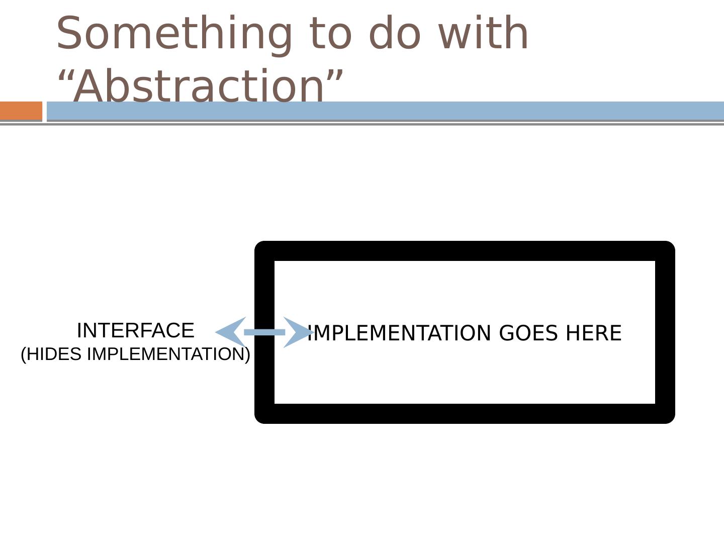 4 .Something to do with “Abstraction” IMPLEMENTATION GOES HERE INTERFACE (HIDES IMPLEMENTATION)