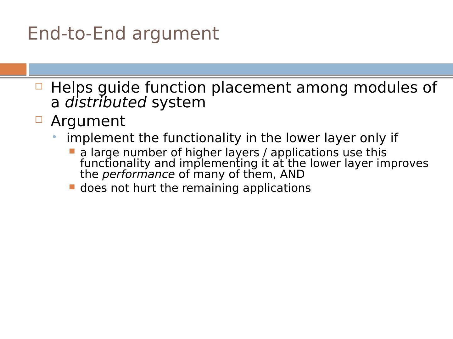9 .End-to-End argument Helps guide function placement among modules of a distributed system Argument implement the functionality in the lower layer only if a large number of higher layers / applications use this functionality and implementing it at the lower layer improves the performance of many of them, AND does not hurt the remaining applications