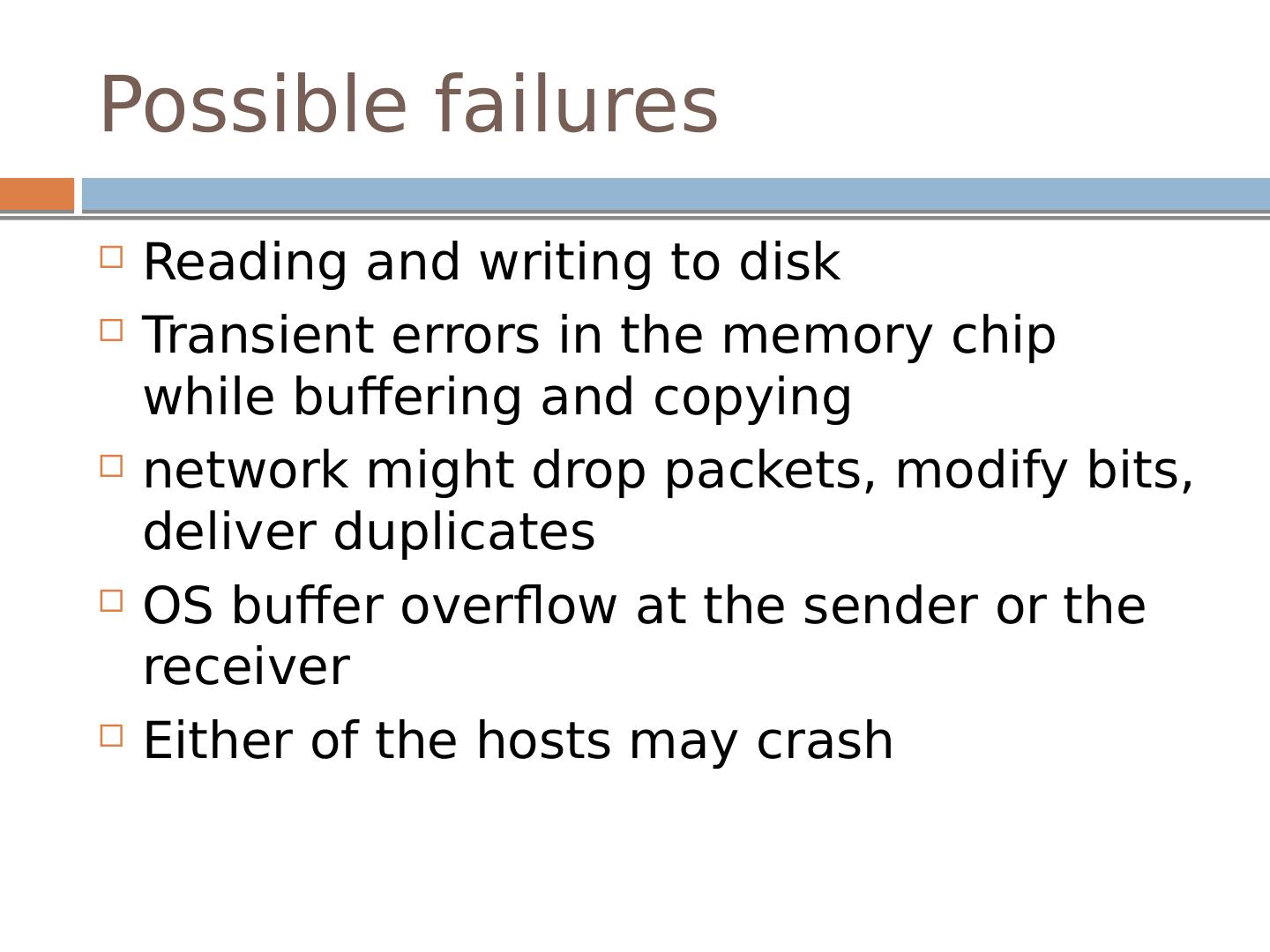 12 .Possible failures Reading and writing to disk Transient errors in the memory chip while buffering and copying network might drop packets, modify bits, deliver duplicates OS buffer overflow at the sender or the receiver Either of the hosts may crash