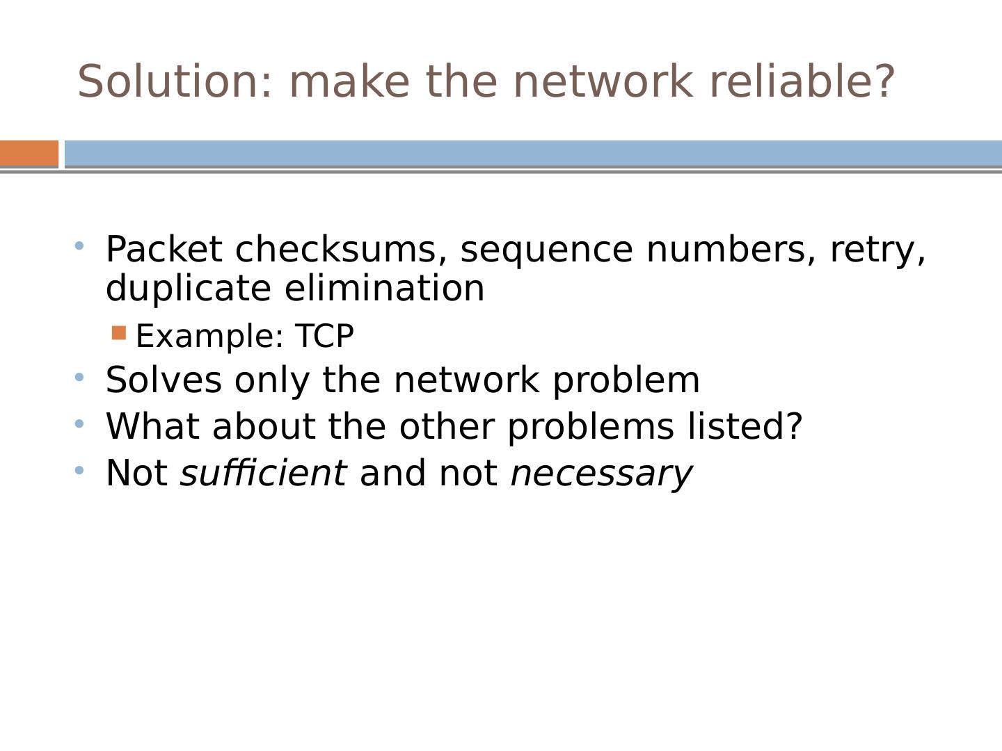 13 .Solution: make the network reliable? Packet checksums, sequence numbers, retry, duplicate elimination Example: TCP Solves only the network problem What about the other problems listed ? Not sufficient and not necessary