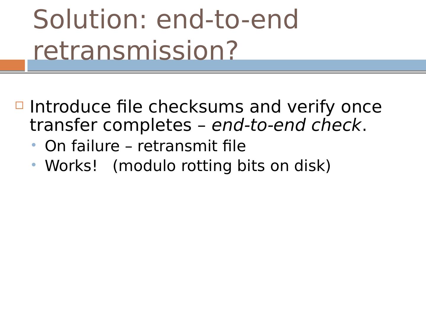 14 .Solution: end-to-end retransmission? Introduce file checksums and verify once transfer completes – end-to-end check . On failure – retransmit file Works! (modulo rotting bits on disk)