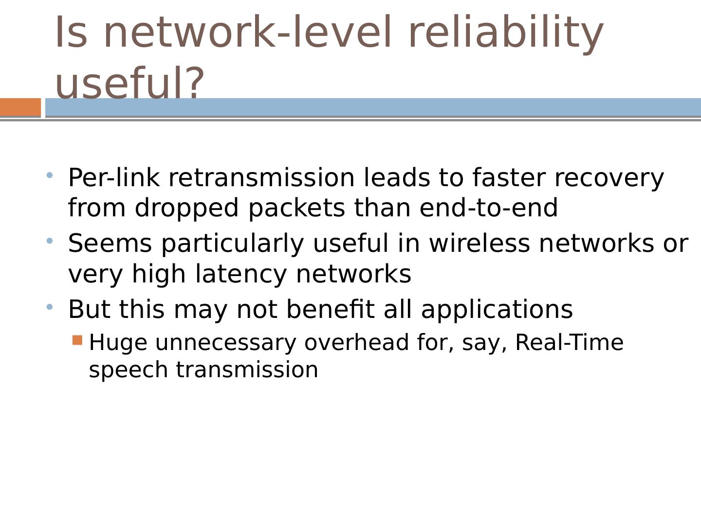 15 .Is network-level reliability useful? Per-link retransmission leads to faster recovery from dropped packets than end-to-end Seems particularly useful in wireless networks or very high latency networks But this may not benefit all applications Huge unnecessary overhead for, say, Real-Time speech transmission