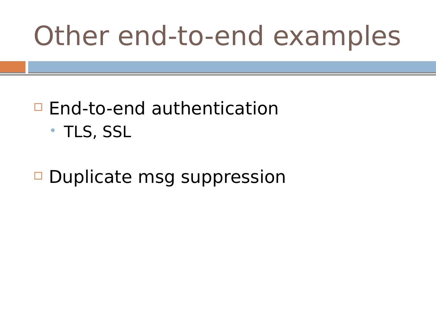 17 .Other end-to-end examples End-to-end authentication TLS, SSL Duplicate msg suppression