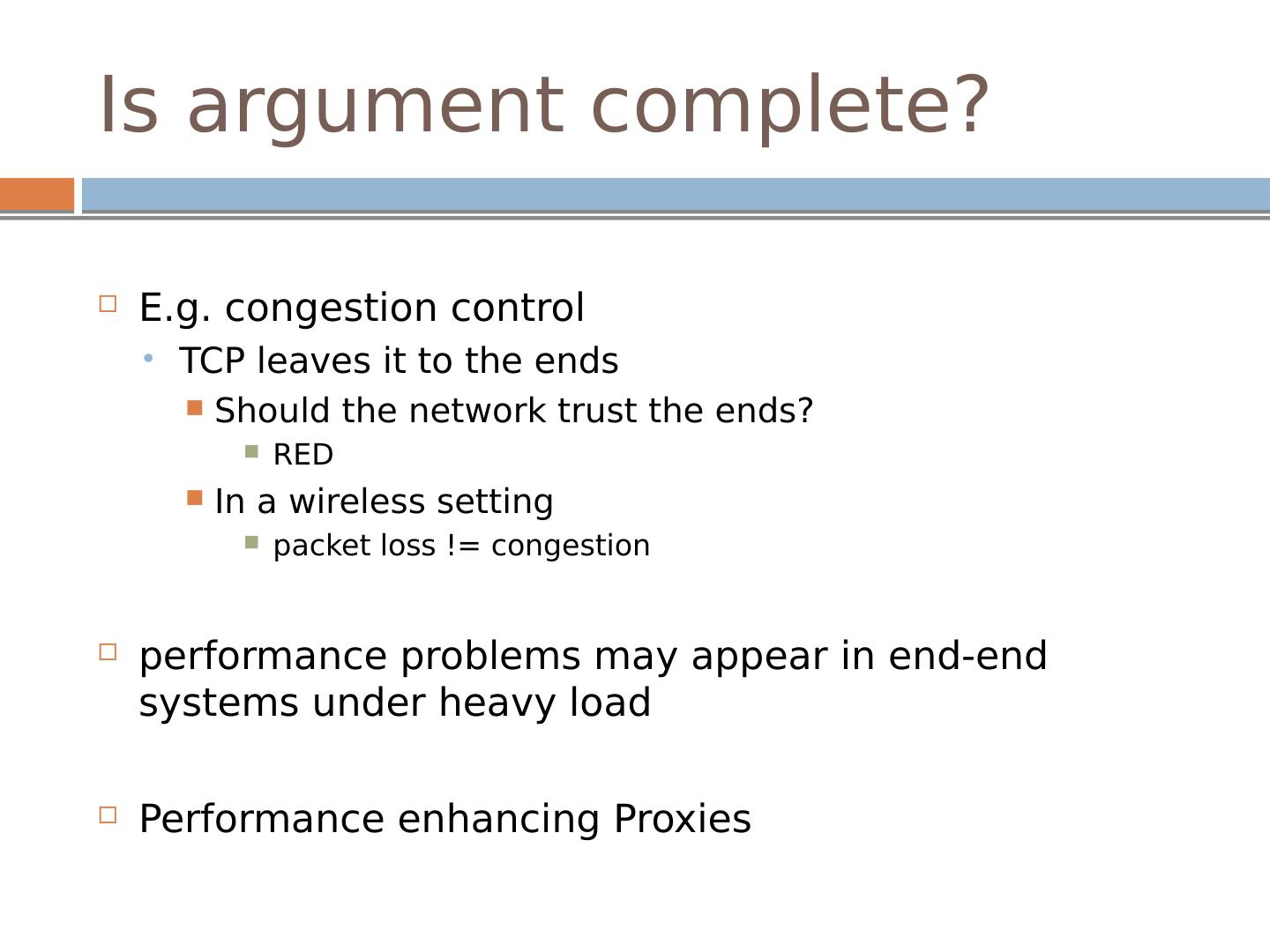 18 .Is argument complete? E.g. congestion control TCP leaves it to the ends Should the network trust the ends? RED In a wireless setting packet loss != congestion performance problems may appear in end-end systems under heavy load Performance enhancing Proxies