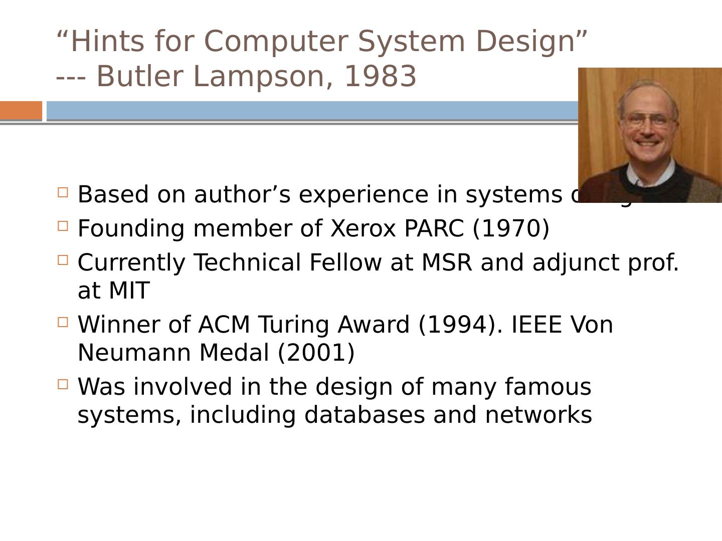 19 .“Hints for Computer System Design” --- Butler Lampson, 1983 Based on author’s experience in systems design Founding member of Xerox PARC (1970) Currently Technical Fellow at MSR and adjunct prof. at MIT Winner of ACM Turing Award (1994). IEEE Von Neumann Medal (2001) Was involved in the design of many famous systems, including databases and networks