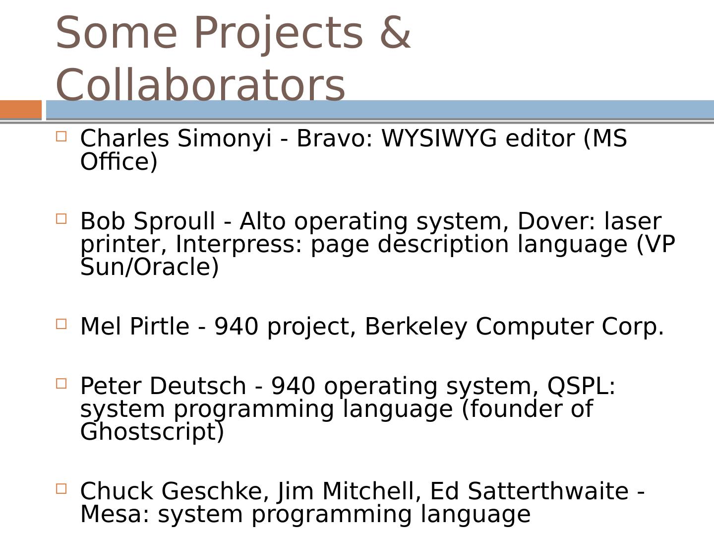 20 .Some Projects & Collaborators Charles Simonyi - Bravo: WYSIWYG editor (MS Office) Bob Sproull - Alto operating system, Dover: laser printer, Interpress : page description language (VP Sun/Oracle) Mel Pirtle - 940 project, Berkeley Computer Corp. Peter Deutsch - 940 operating system, QSPL: system programming language (founder of Ghostscript ) Chuck Geschke , Jim Mitchell, Ed Satterthwaite - Mesa: system programming language